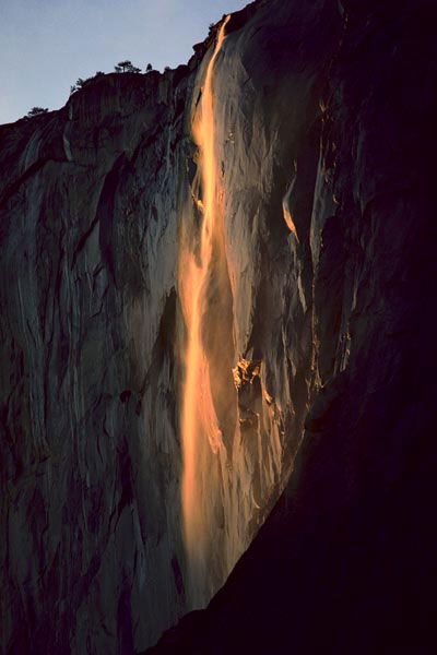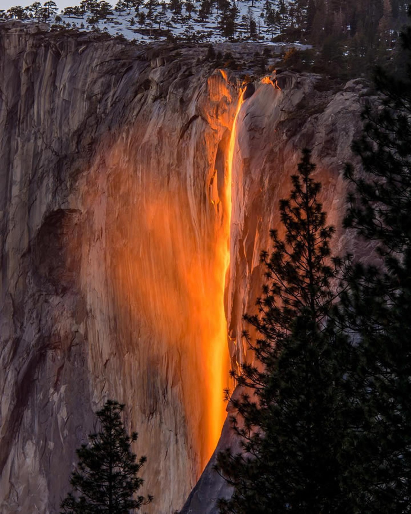 원래 폭포 감상의 최적기는 눈이 녹아 수량이 불어나는 4월에서 6월입니다. 하지만 2월에는 엘 캐피탄(EL CAPITAN)에서 주홍빛 용암이 흘러내리는 것과 같은 특별한 불타는 폭포를 볼 수 있어요. 이 불타는 폭포는 호스테일 폭포(HORSETAIL FALL)에서 볼 수 있답니다. 이런 현상은 10월에도 발생하지만 일반적으로 이 시점에는 물의 양이 충분하지 않다고 합니다.