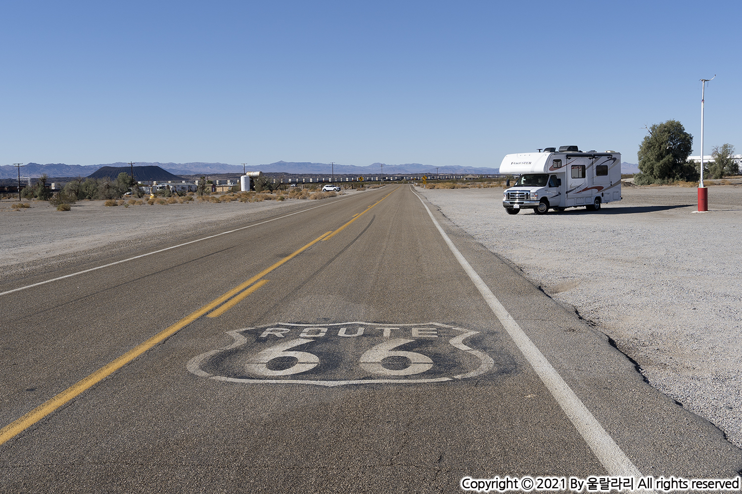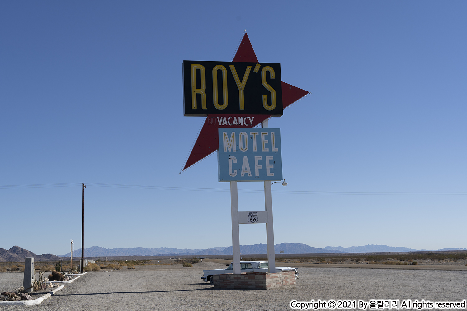 66번 도로를 달리다 보면 도로 위에 ROUTE 66 표시가 종종 보이기는 합니다. 하지만 차를 세울 곳이 마땅치 않죠. 그럴 땐 안전하게 로이스 모텔에 잠시 정차해서 인증샷을 남기는 게 좋겠죠. 장시간 운전으로 인한 피로도 풀 겸 말이죠. ^-^