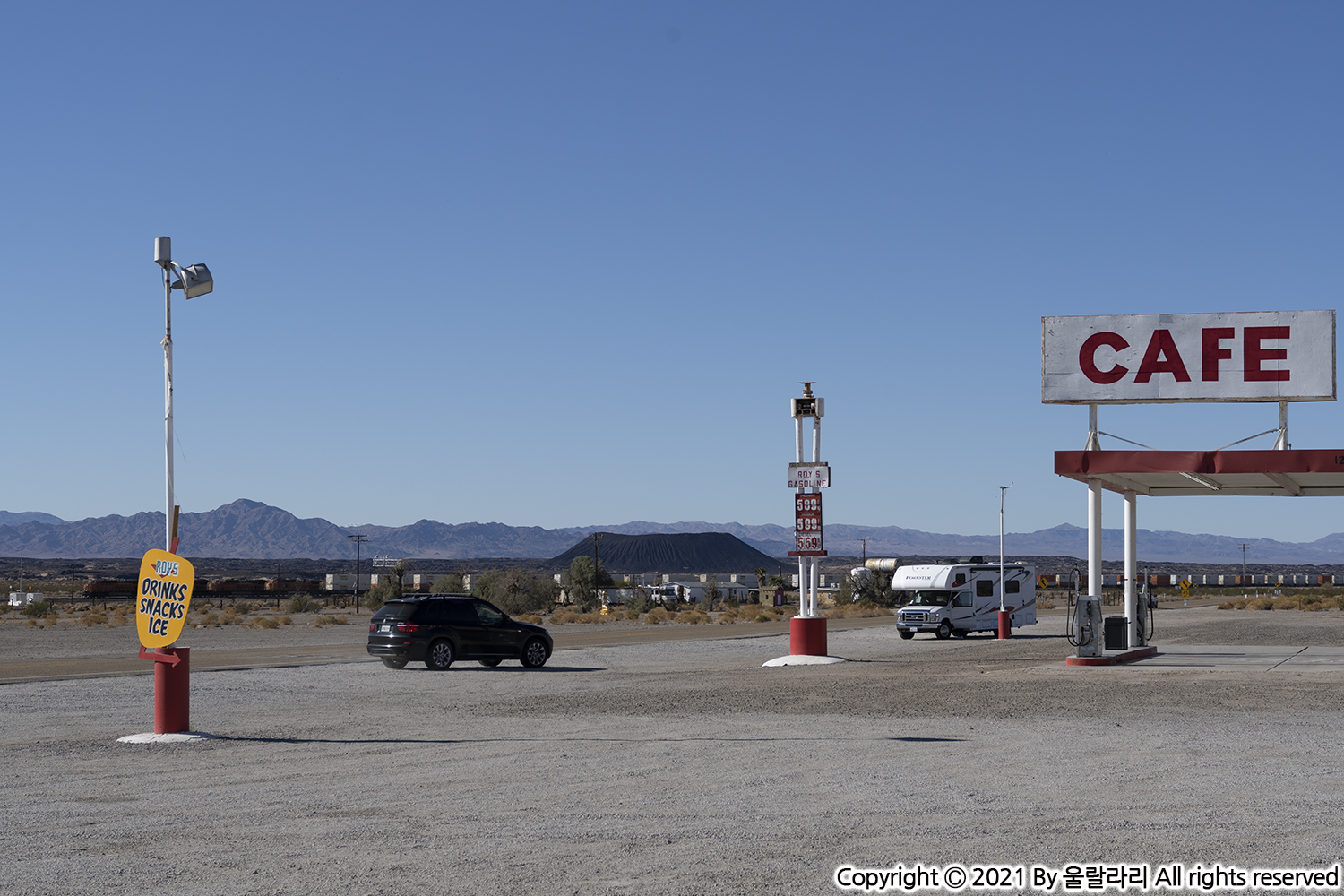 목적지인 로이스 모텔 카페 Roy's Motel & Cafe로 가는 길에 검은 화산을 보게 될 텐데, 앰보이 크레이터 Amboy Crater라는 곳입니다. 이 화산의 나이는 약 7만 9천 년이며, 1973년 국립 자연 명승지 National Natural Landmark로 지정되었습니다. 앰보이 크레이터에는 화산 분화구 정상까지 갈 수 있는 트레일이 있다고 해요. 이곳 역시 사막인 모하비 국립 보호 구역 Mojave National Preserve에 속하므로 10월에서 4월 사이 선선한 날씨에 하이킹을 하길 권합니다.