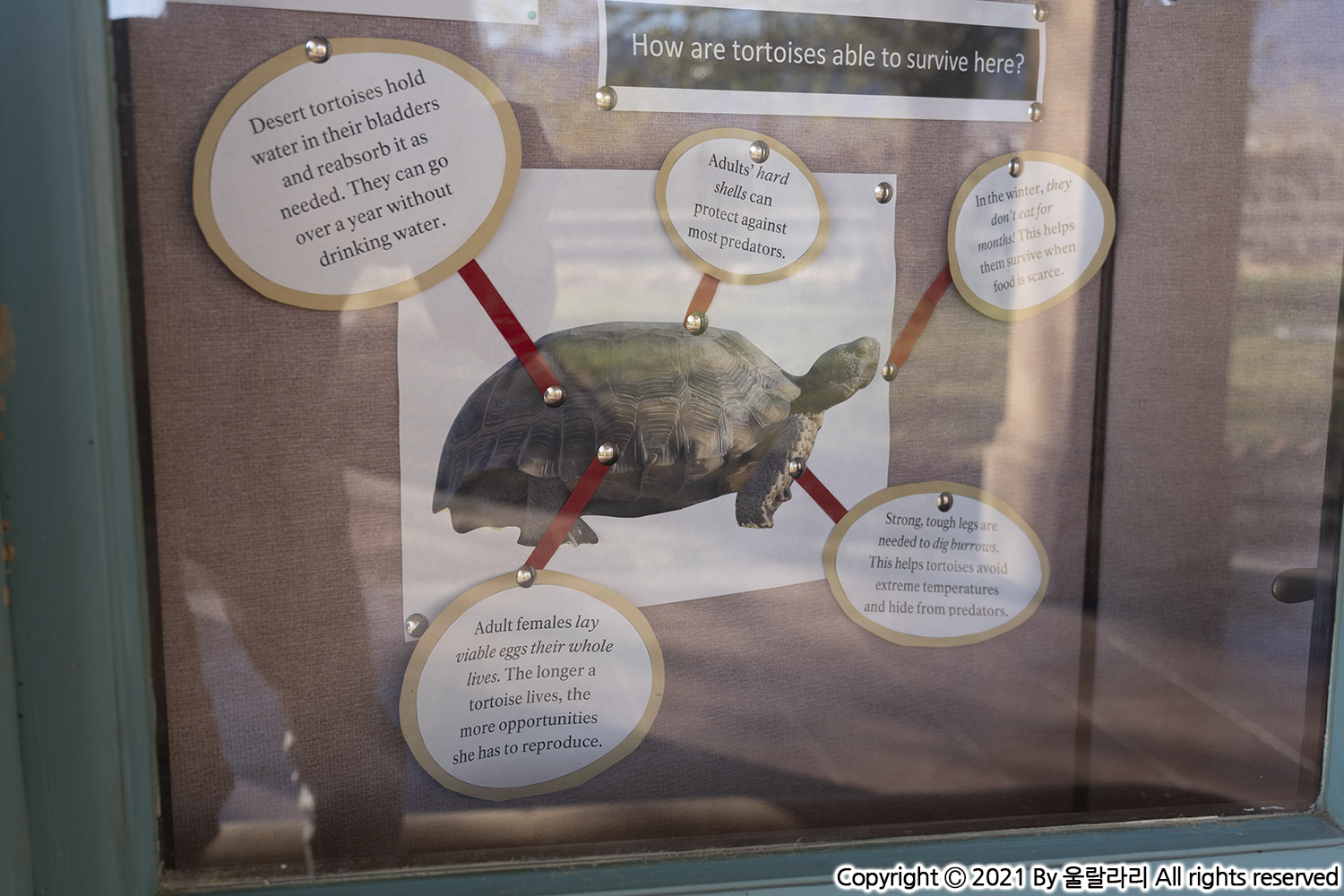 생명체라곤 없을 것 같은 모하비 사막에는 여러 동물이 살고 있는데, 그중에 가장 흥미로웠던 동물은 거북이입니다. 물도 없이 어떻게 살지 궁금했는데, 방광에 물을 저장해 두었다가 필요할 때마다 몸으로 흡수시킨다고 하네요. 그 상태로 일 년 동안 물 없이 살아갈 수 있다고 해요. 정말 대단한 생명체 구만.