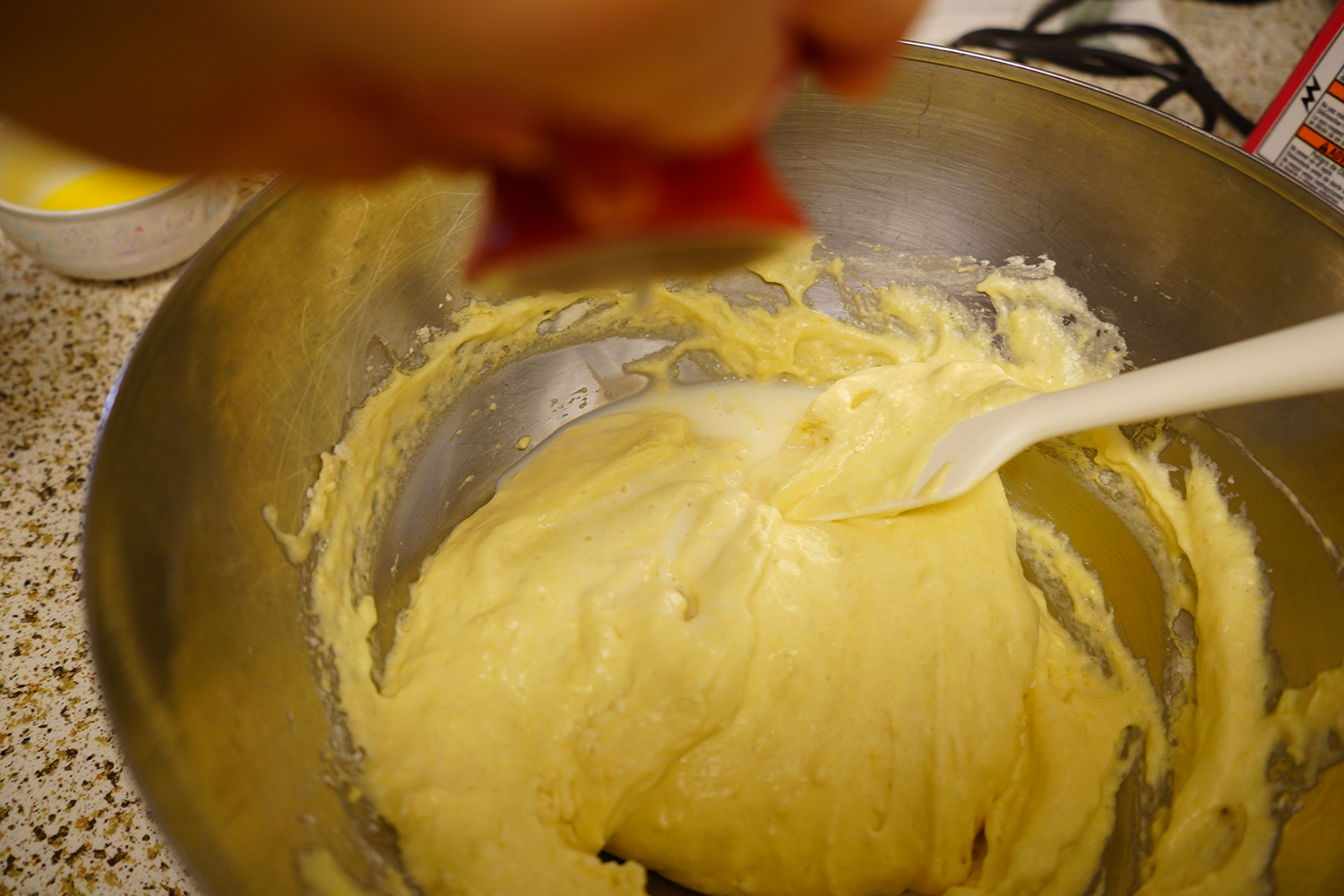 우유를 넣고, 녹인 버터를 넣고 섞어요.