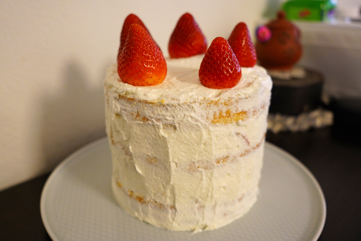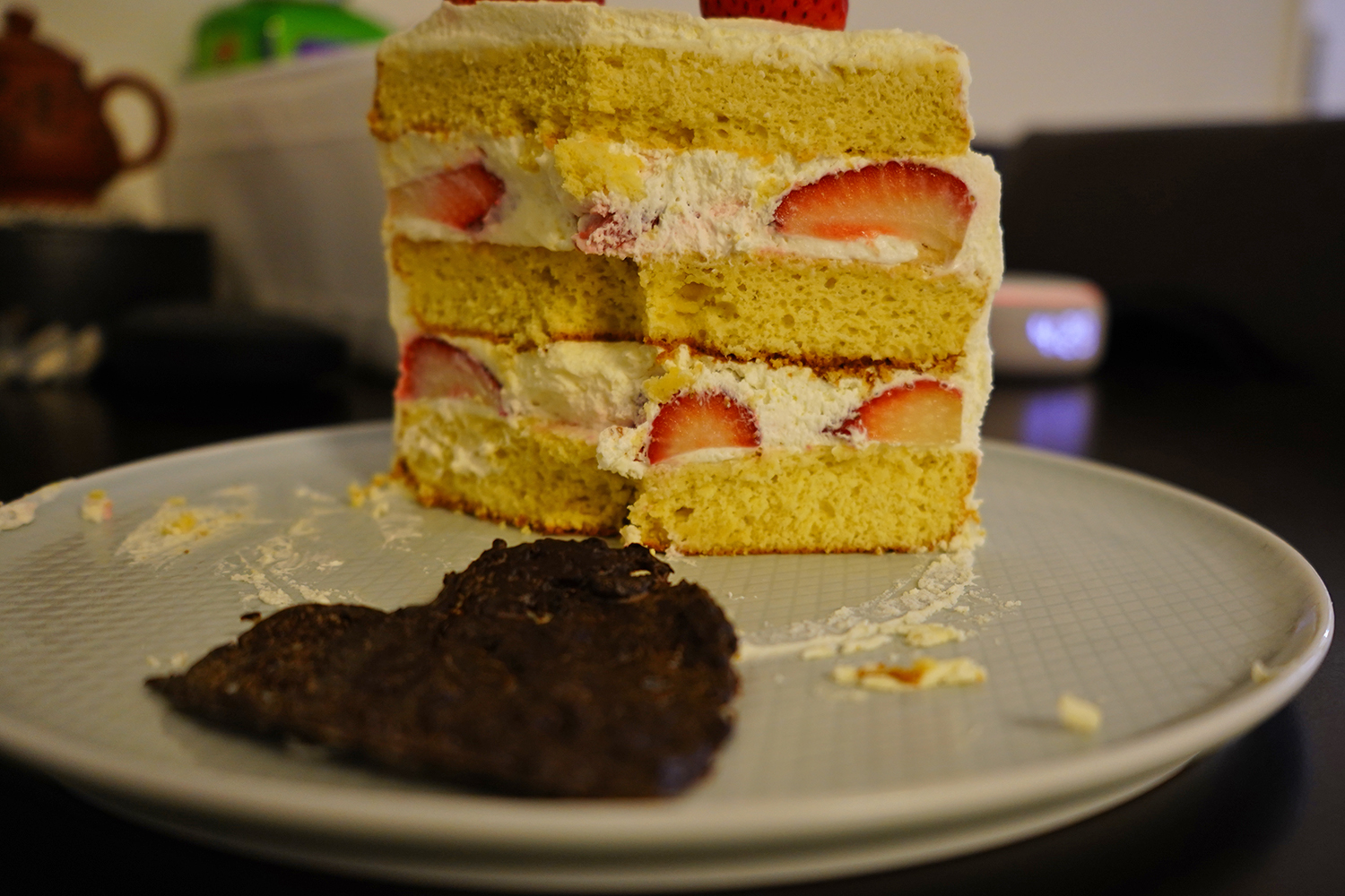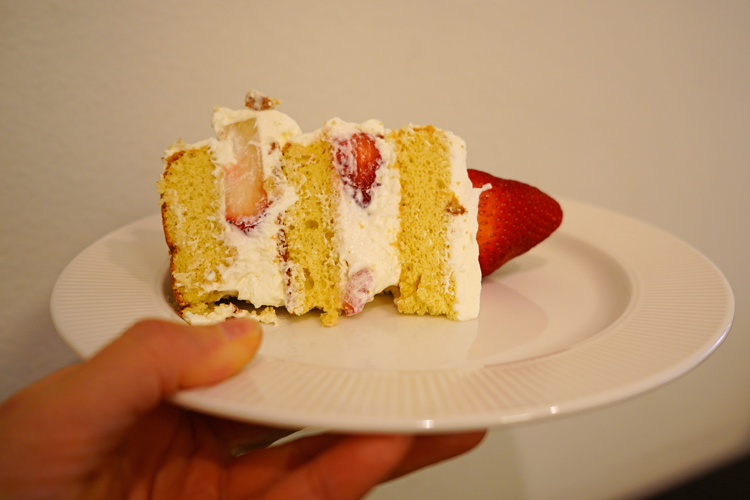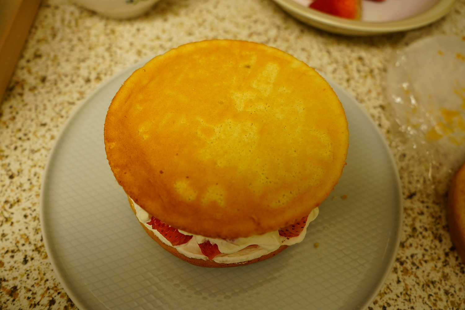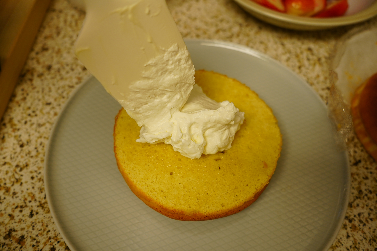 원래는 돌림판을 돌려가면서 크림을 발라야 하는데, 집에 그런 게 있을 리 없잖아요. ㅋ 집에서 제일 큰 접시 사용. 크림을 잘 바르려면 긴 스패츌라도 필요한데 그런 것도 집에 있을 리가 없잖아요. ㅋ 알뜰 주걱 사용. -_- 그래서 이런 결과가 나온 걸까요? 생각보다 크림이 두껍게 발라지지 않더라고요. 의도치 않게 누드 생크림 케이크처럼 되어 버렸어요.
