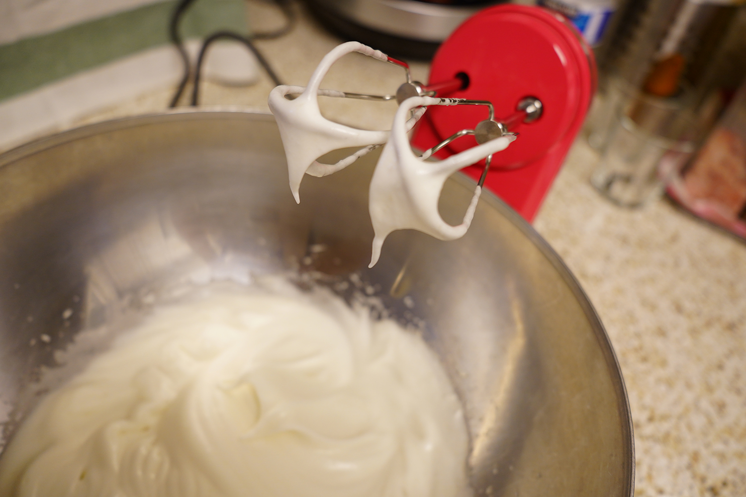 흰자 머랭을 만들어요. 거품을 내면서 설탕은 3~4번 나눠서 넣어주세요. 뿔이 이 정도 구부러질 정도까지만 머랭을 올려줍니다. 아주 단단할 필요는 없어요.