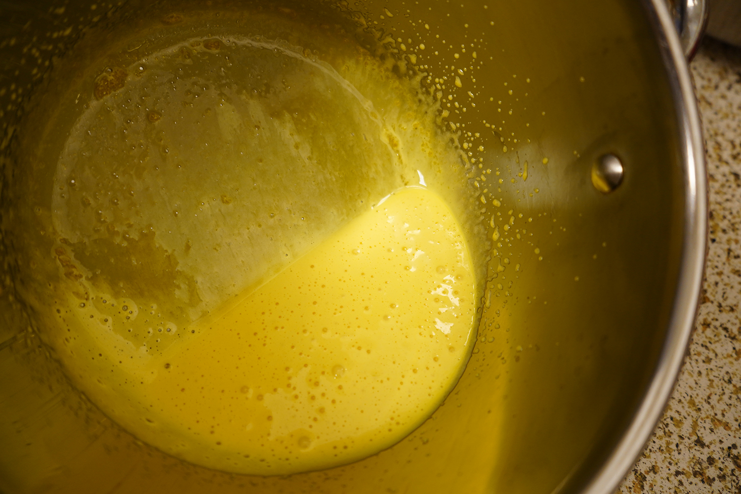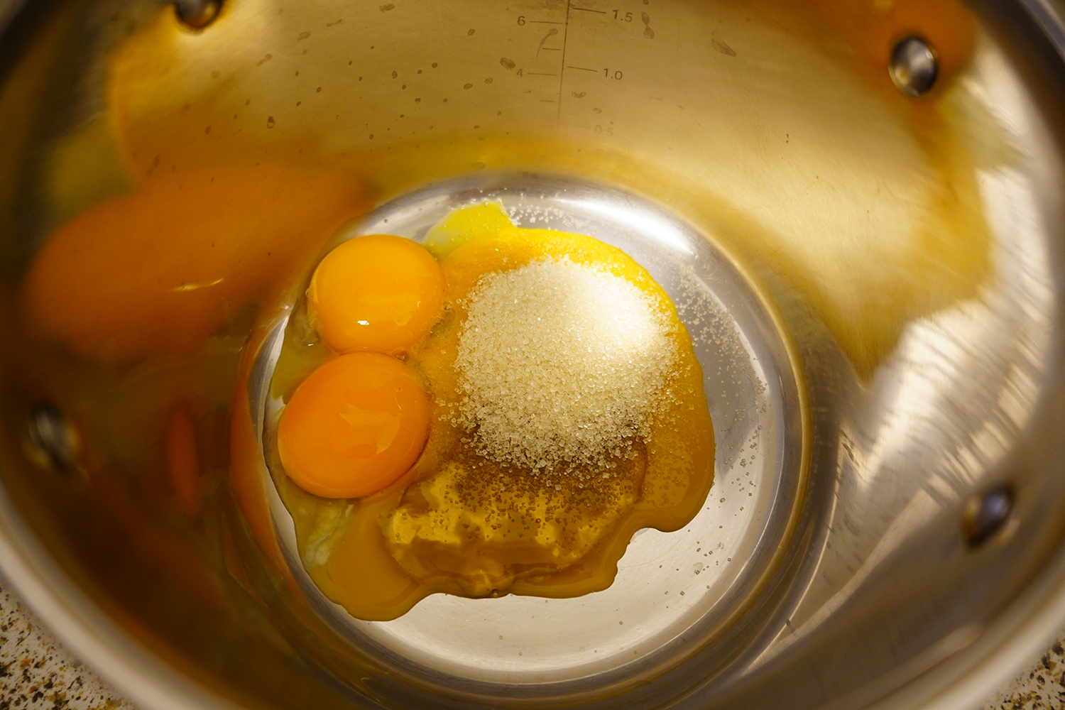 노른자 머랭을 만들어요. 설탕, 꿀, 노른자를 모두 넣고, 미색이 될 때까지 휘핑합니다.