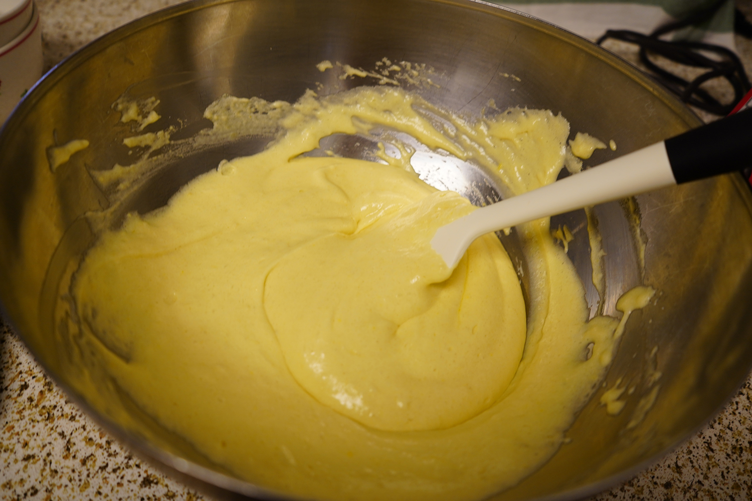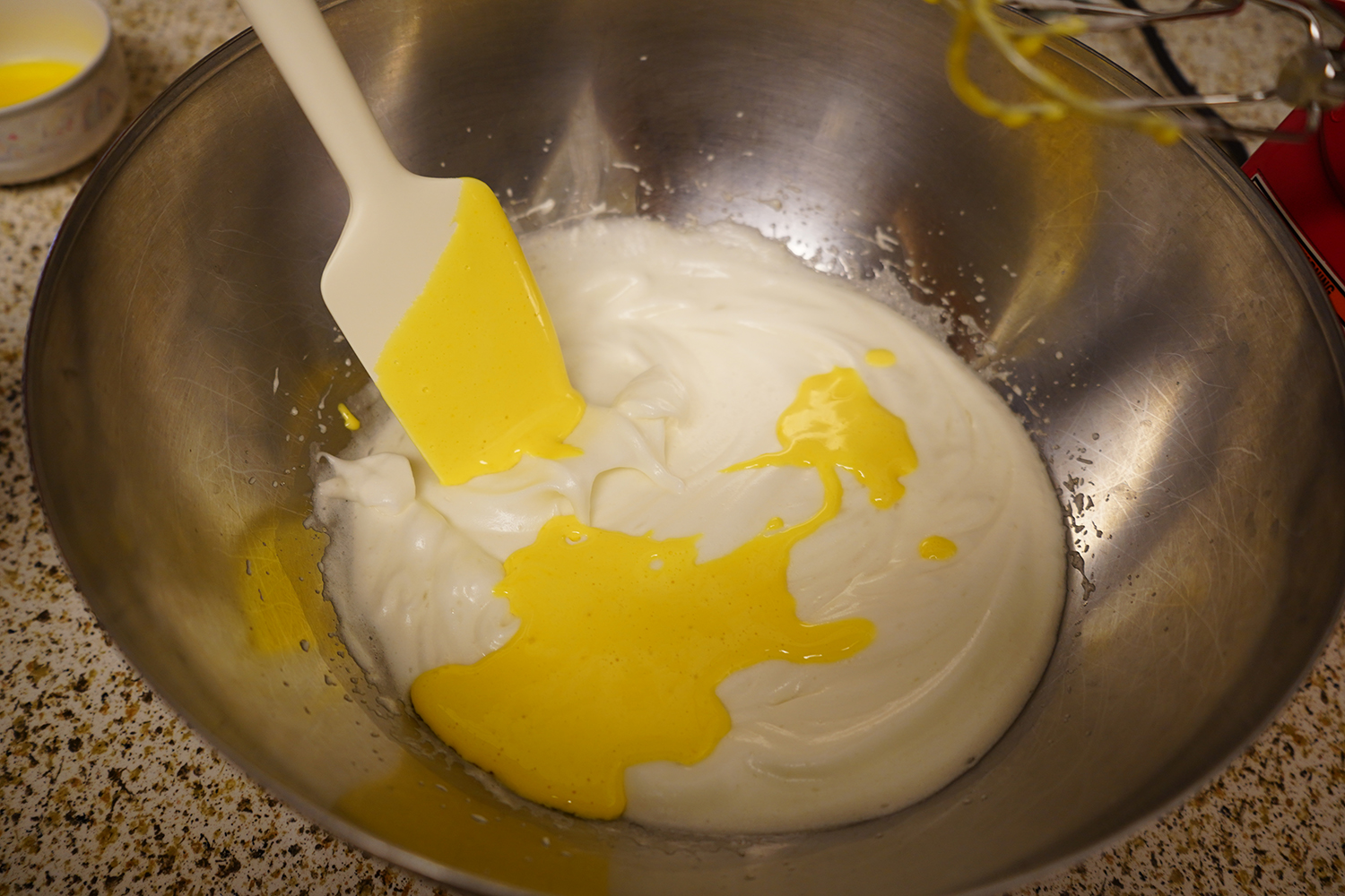흰자 머랭에 노른자 머랭을 2번 나눠서 넣어가며 머랭이 꺼지지 않게 살살 섞는다.