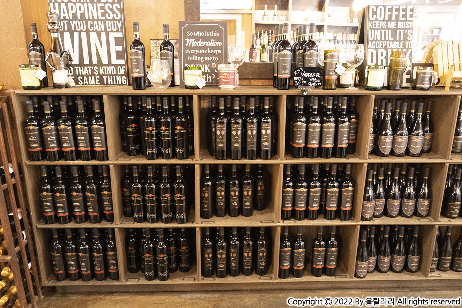 안으로 들어와서 뭐 살 거 없나, 기웃거려 봤어요. 윌슨 크릭 와이너리에서 가장 유명한 와인은 아몬드 스파클링 Almond Sparkling과 화이트 카베르네 소비뇽 White Carbernet Sauvignon이에요. 화이트 카베르네 소비뇽은 집에 돌아오는 길에 레이크 엘시노어 Lake Elsinore 코스트코에서 $11.99에 구매했어요.