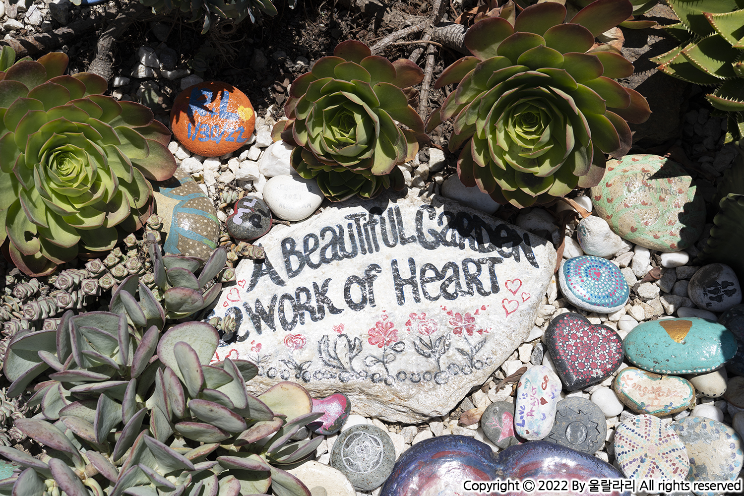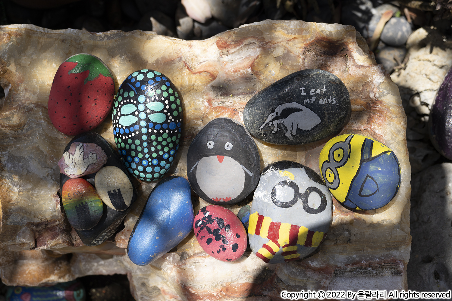 수년 전 이곳은 쓰레기 투성이었어요. 근처에 살던 데이브 딘 Dave Dean은 스스로 청소를 하고, 식물들을 구입해 직접 심기까지 했어요. 문라이트 비치에서 자갈들을 옮겨 길까지 만들었지요. 그러다가 2015년 근처에 머물던 한 관광객이 멋진 정원을 제공한 데이브에게 감사를 표하기 위해 이곳에 있던 돌멩이에 그림을 그렸다고 해요. 그때 데이브는 좋은 생각이 났다고 합니다. 바로 방문객들에게 돌에 그림을 그리게 했던 거죠.