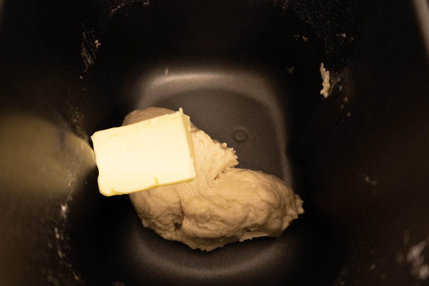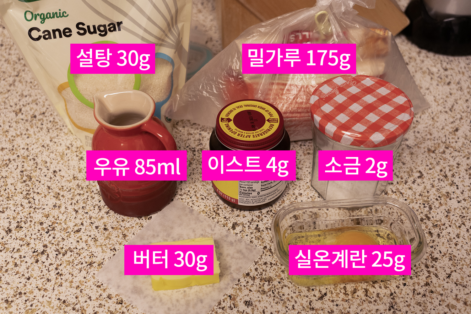 버터를 제외한 모든 재료를 한 덩어리가 될 때까지 반죽하고, 버터를 추가하여 표면이 매끈해지도록 반죽합니다.