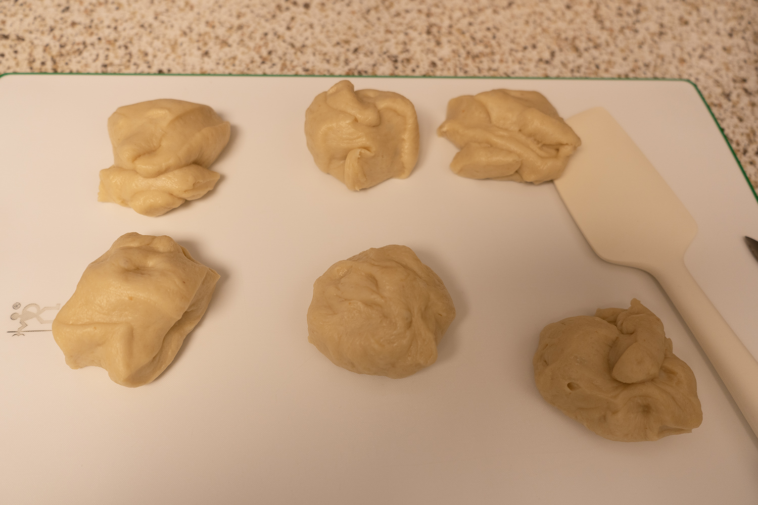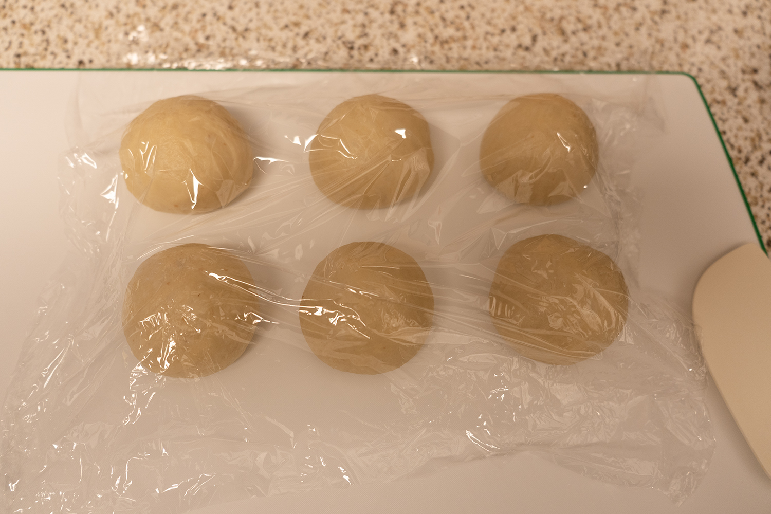 따뜻한 곳에서 1시간 1차 발효(저는 따뜻한 물 한 컵과 반죽을 함께 오븐이나 전자레인지에 넣어둡니다.)를 하고, 6개로 분할합니다. 둥글리기를 하고, 랩을 씌워 15분 휴지 시간을 가져요.