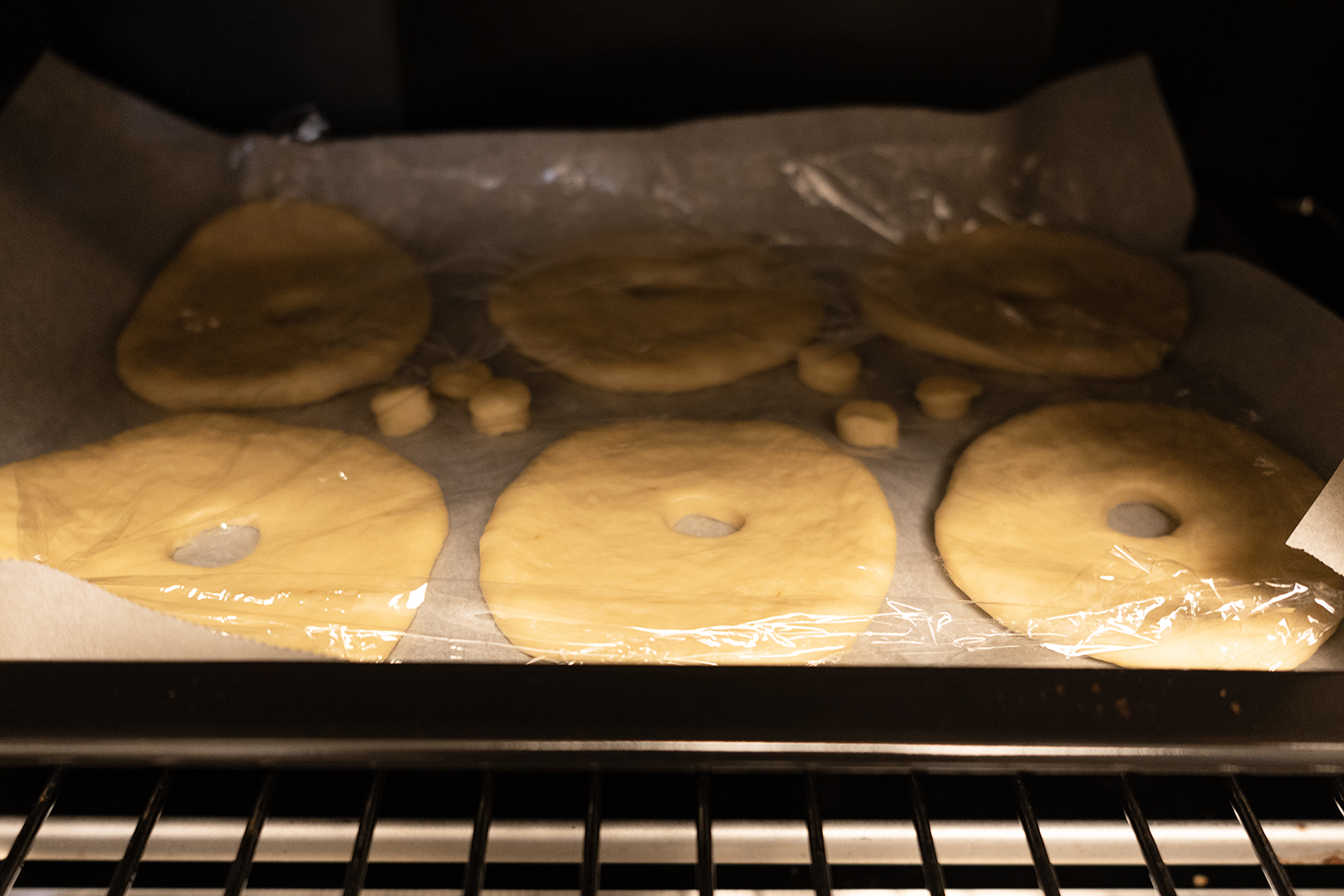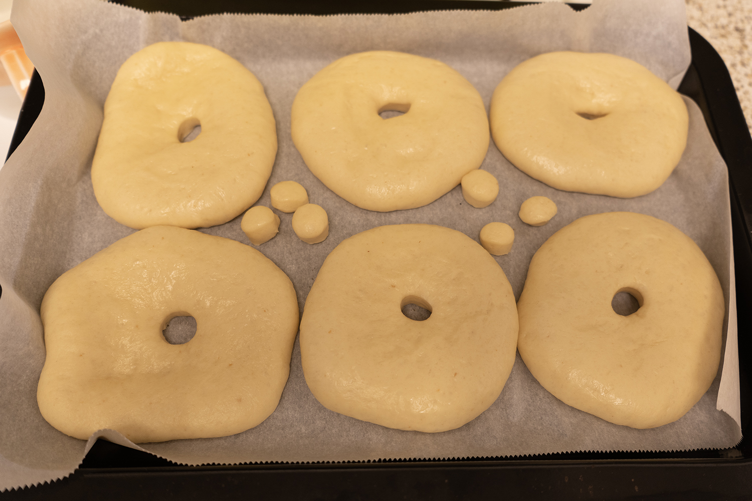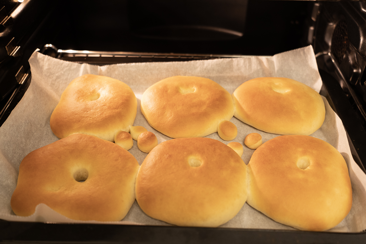 잘 부풀도록 1시간 2차 발효를 합니다. 모양이 많이 찌그러졌어요. ㅜ.ㅜ 굳이 6개로 만들 필요도 없고, 굳이 9cm로 만들 필요도 없어요. 저는 나중에 다시 만들게 된다면 이것보다 더 작게 만들 거예요.