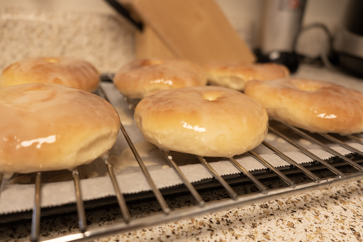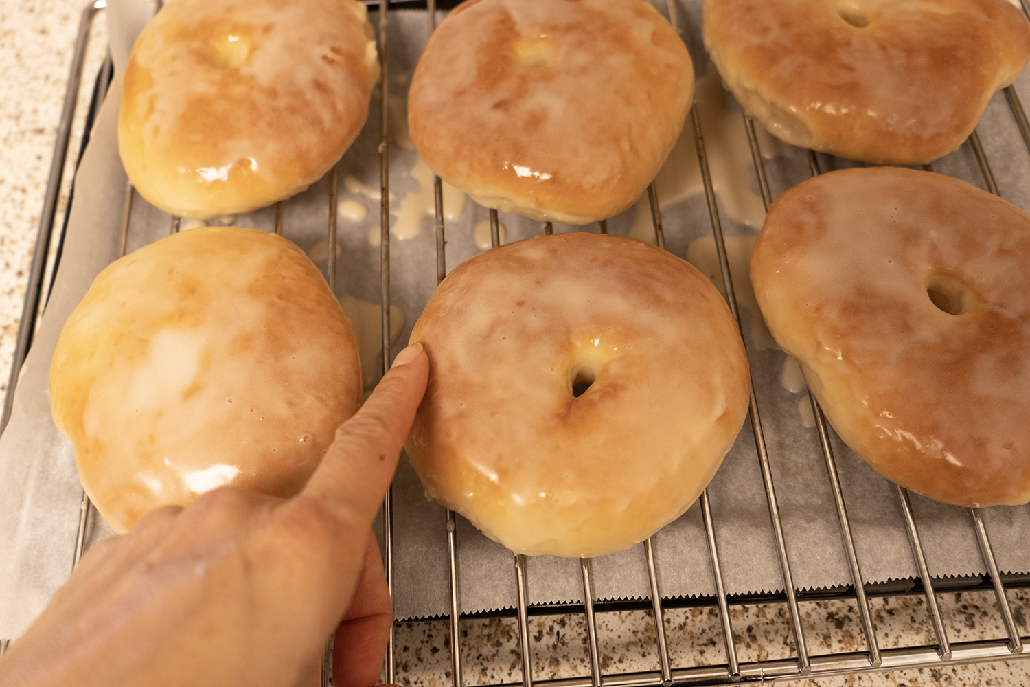 글레이즈를 바른 빵을 쿨링 랙에 올리고, 아래에는 글레이즈가 자연스럽게 흘러내릴 수 있도록 팬을 받쳐 둡니다.