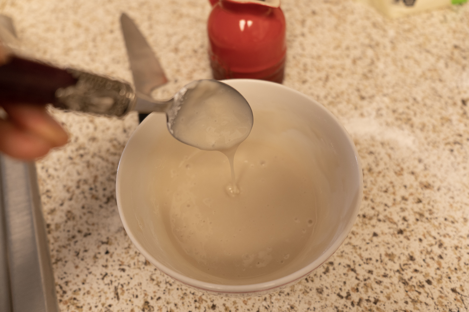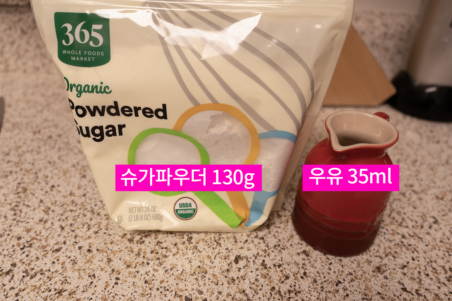 슈가 파우더는 체에 곱게 내리고, 우유와 함께 섞어요.