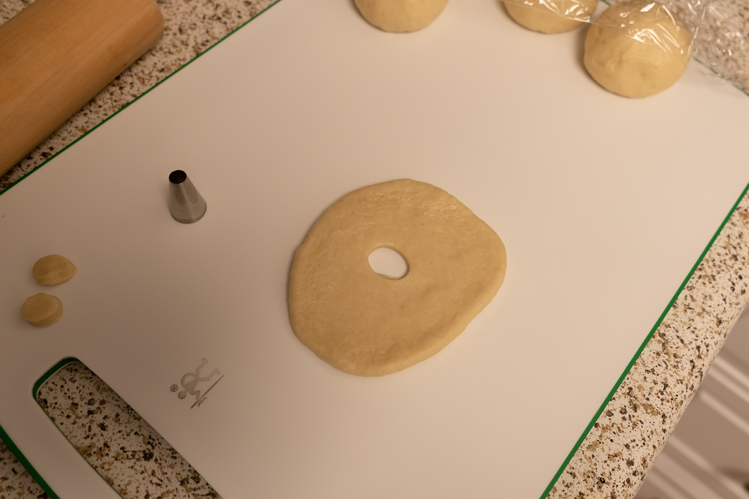 한 덩어리를 지름 9cm로 밀고, 가운데를 동그랗게 뚫어요. (마땅한 도구가 없어서 파이핑 팁을 사용했더니 너무 작네요.) 나머지 다섯 덩어리도 같은 방법으로 만들어 줍니다.