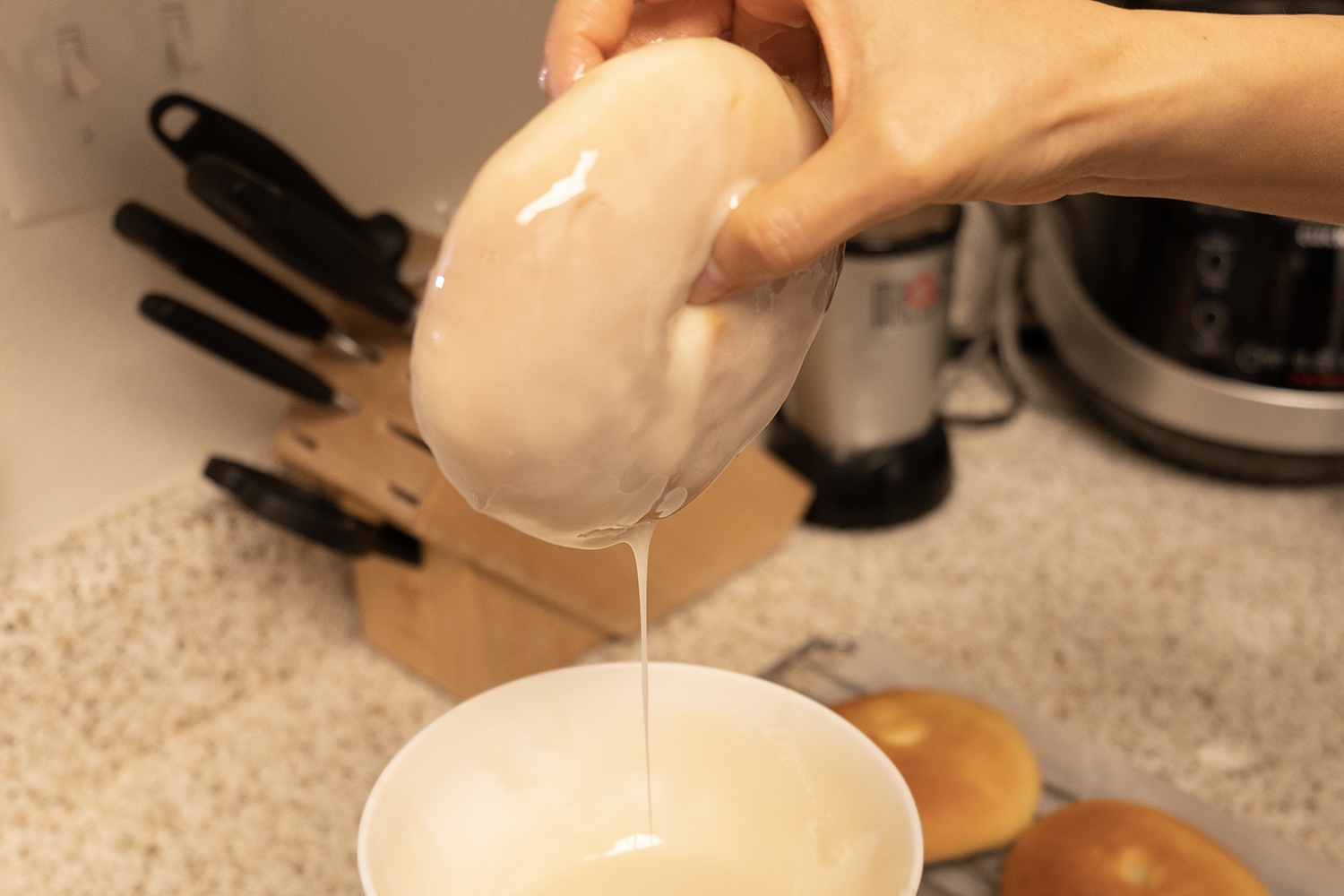 오븐에서 다 구워진 빵을 꺼내 식히고, 약간의 온기가 남아있을 때 아까 만든 글레이즈를 빵 앞뒤로 묻힙니다. 글레이즈를 큰 그릇에 만들었어야 했는데. 묻힐 때 조금 힘들었어요.