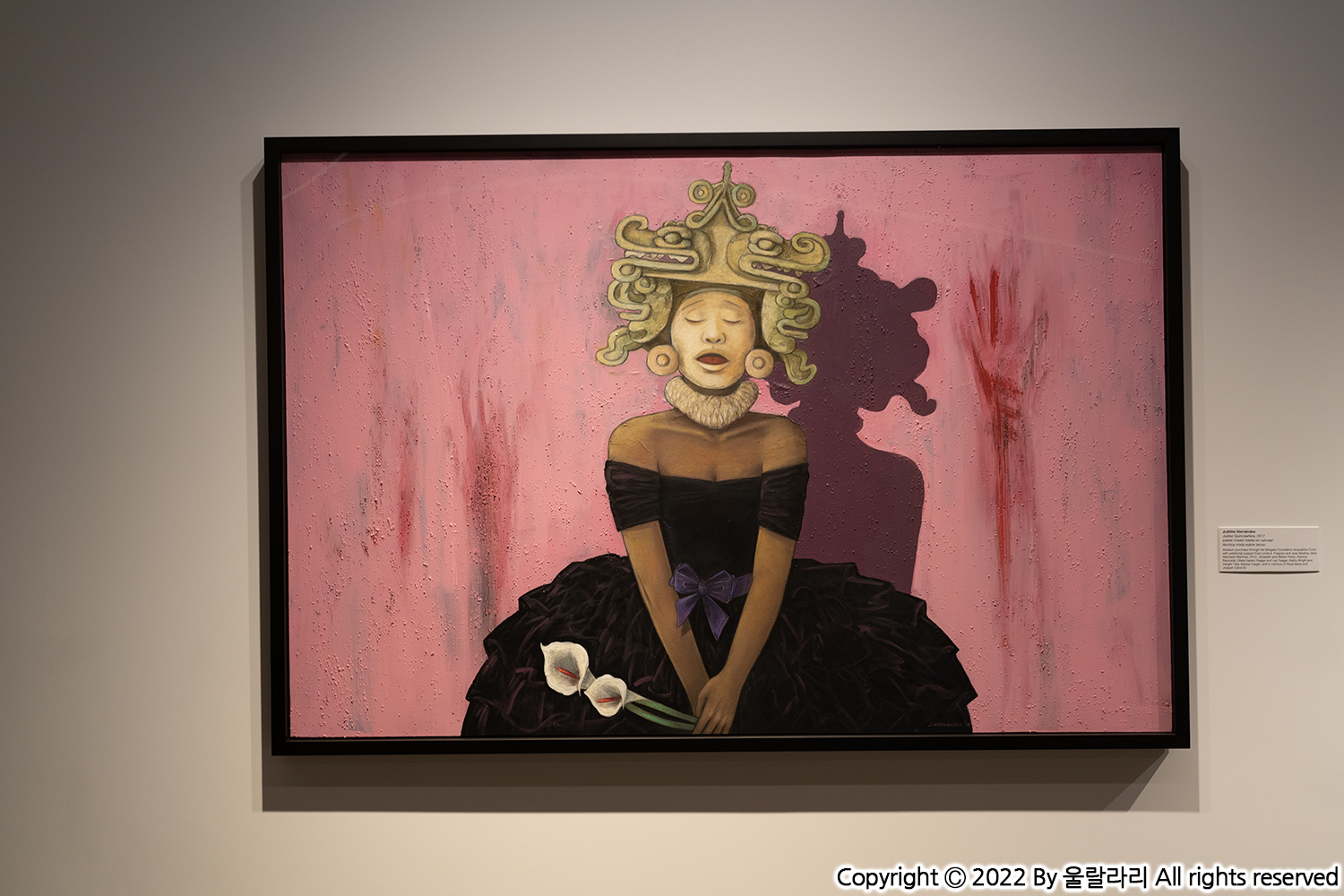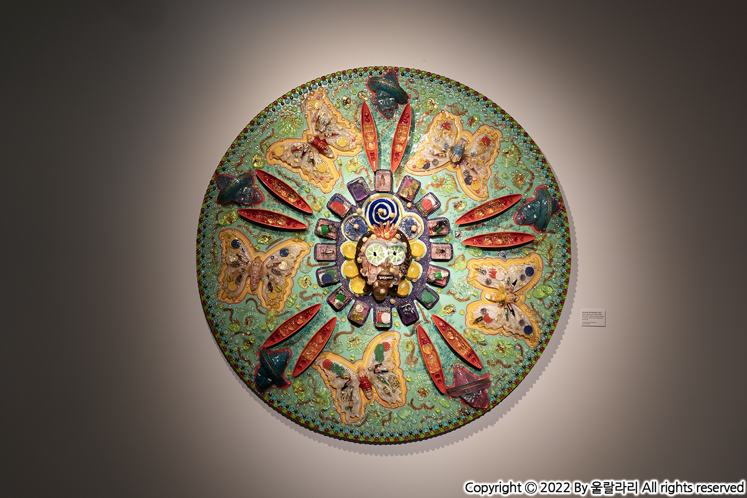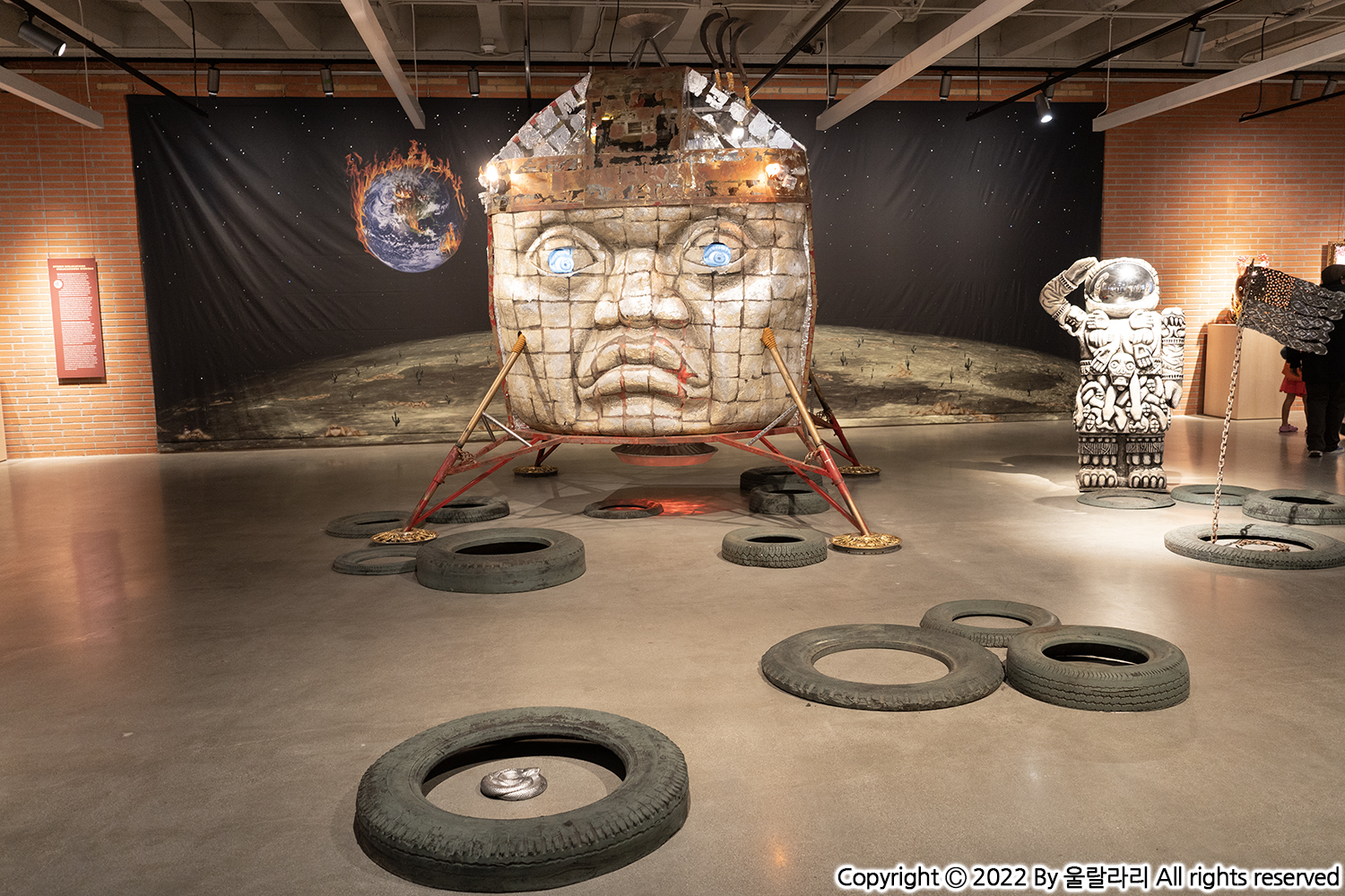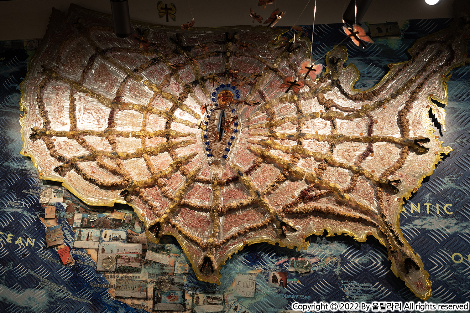 미술관 안으로 처음 들어왔을 때 본 작품입니다. Gaiatlicue (코아틀리쿠에 Coatlicue), 고대 멕시코의 아스테카족 신화에 나오는 대지의 여신입니다. 배경에는 로스앤젤레스에서 리버사이드까지의 지도가 있고, 고속도로는 캘리포니아 토종꽃으로 덮여 있어요. 2층 특별 전시를 맡고 있는 de la Torre Brothers의 작품입니다.