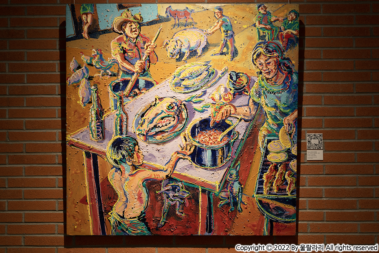 이 그림은 정말 인상 깊었어요. 배경은 호수에 비친 아름다운 일몰을 표현했는데, 앞에는 경찰과 노점상들이 대치하고 있는 모습을 대조적으로 그렸어요. 생계를 위해 열심히 일하는 노점상들은 아름다운 풍경을 즐길 마음의 여유가 없겠죠.