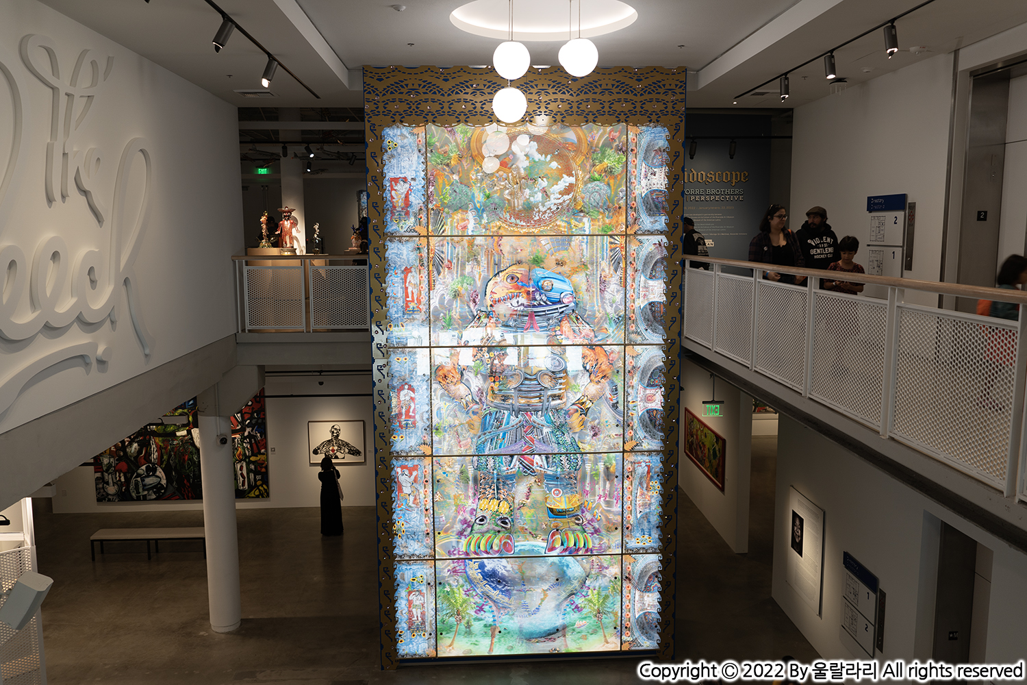 내부에 들어서면 26피트 높이의 대형 렌티큘러 작품이 눈에 들어옵니다. 렌티큘러는 보는 각도에 따라 그림이 다르게 보여 입체감이 느껴지는 기법입니다. 몇십 년 전에 많이 유행했었던 걸로 기억해요. 책받침 같은 것도 있었고. 심지어 CD에도 들어있었어요. 나만 기억하나? -_-a;;