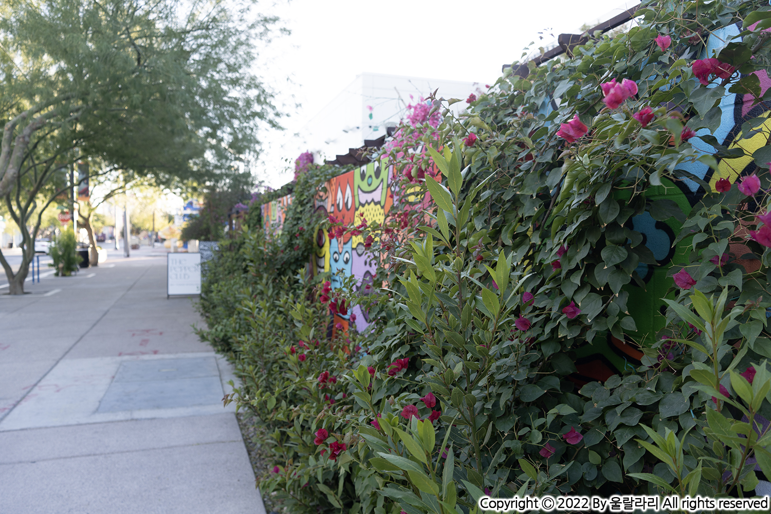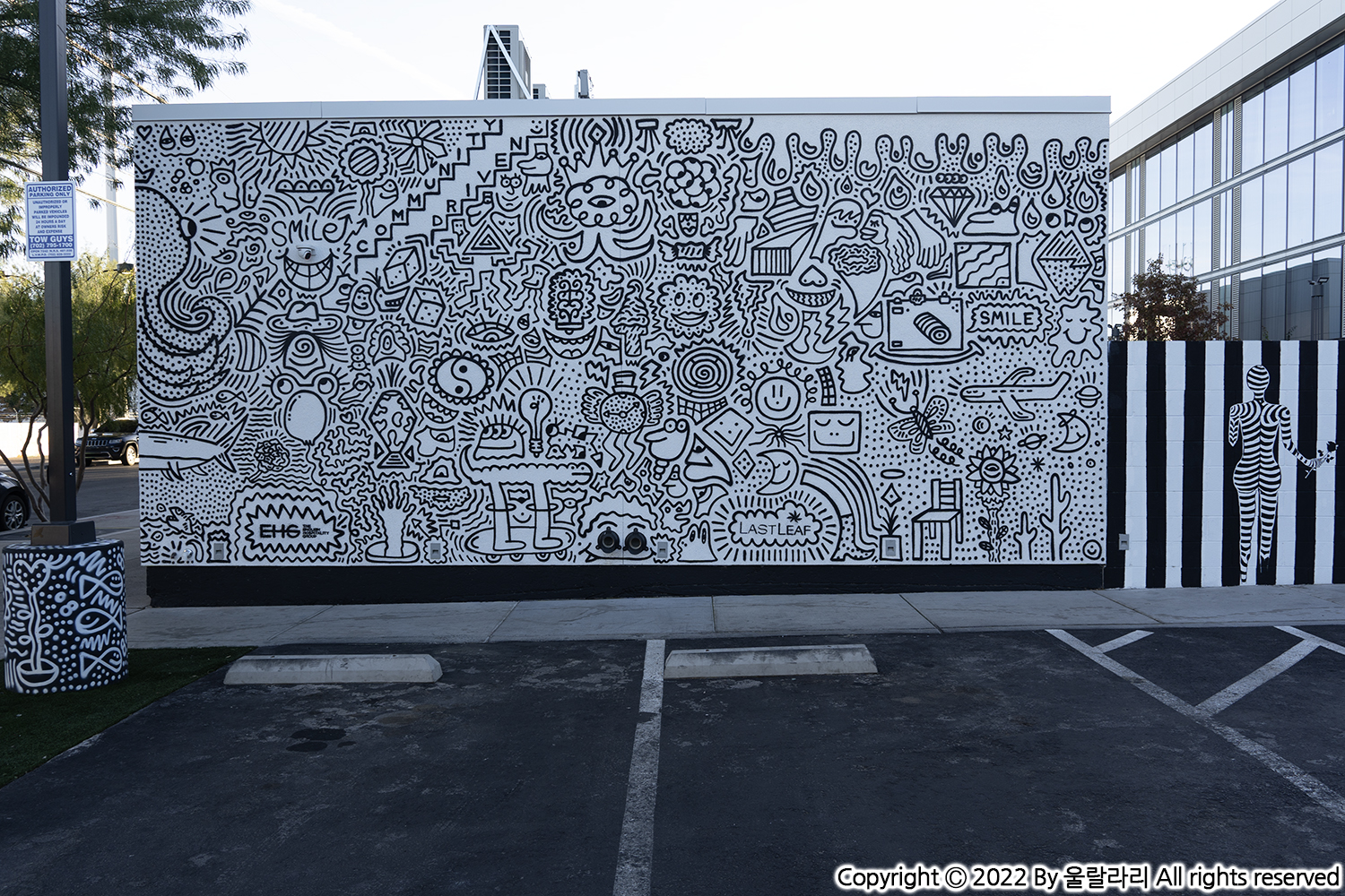호텔 투숙객도 많지 않은지 주차장도 작아요. 공간이 다 채워지면 옆 거리에 스트리트 파킹을 할 수 있습니다. 처음 예약할 때 호텔 사진을 보니 벽화들이 많았는데, 정말로 호텔 주변 담벼락으로 흥미로운 벽화들이 그려져 있더라고요. 아마도 여기가 라스베가스 아트 디스트릭트에 속해서이지 아닐까요?