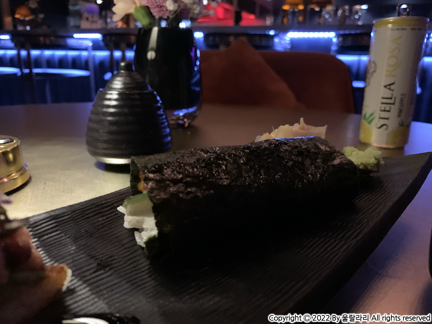 3:30부터 5:30까지는 해피아워라서 술 한잔과 간단한 안주를 주문해서 먹으면... 그래도 비싸요. ㅜ.ㅜ 크리스피 라이스와 장어 핸드롤을 각각 $8에 주문해서 술과 함께 먹었습니다. 곰배님, 소원 풀었어? ^-^