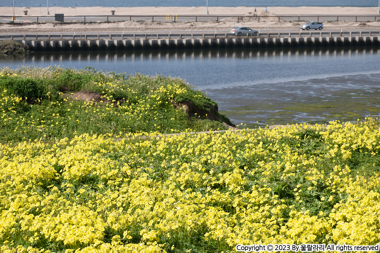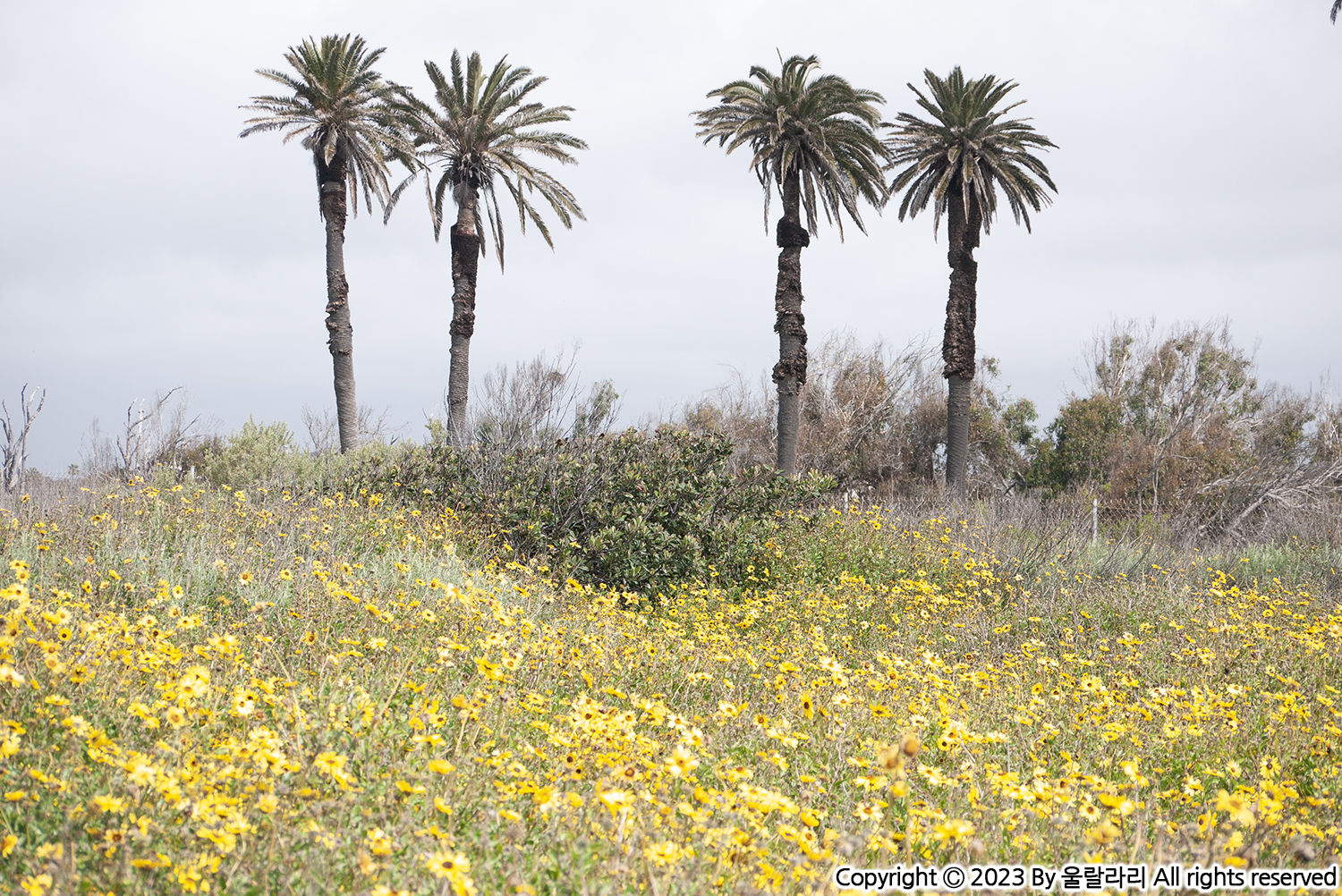걷다 보면 팜트리가 보이는데, 여기는 분위기가 사뭇 다릅니다. 멀리서만 봐도 느껴지나요? 노란 꽃이 잔뜩 피어있죠.