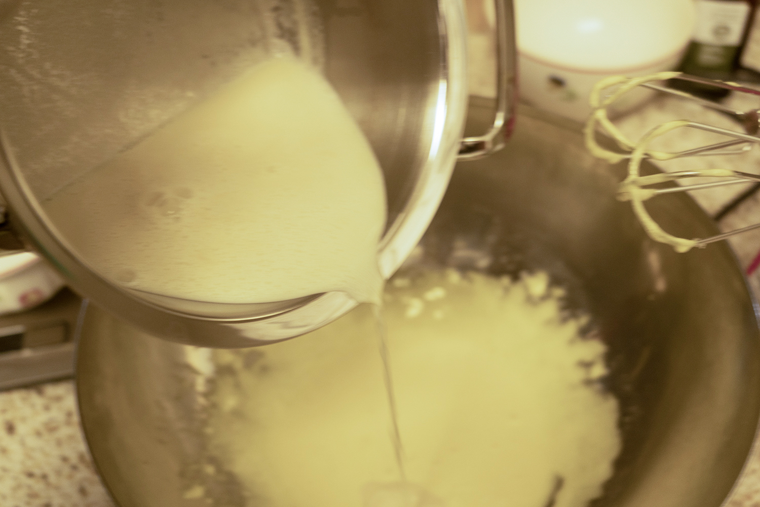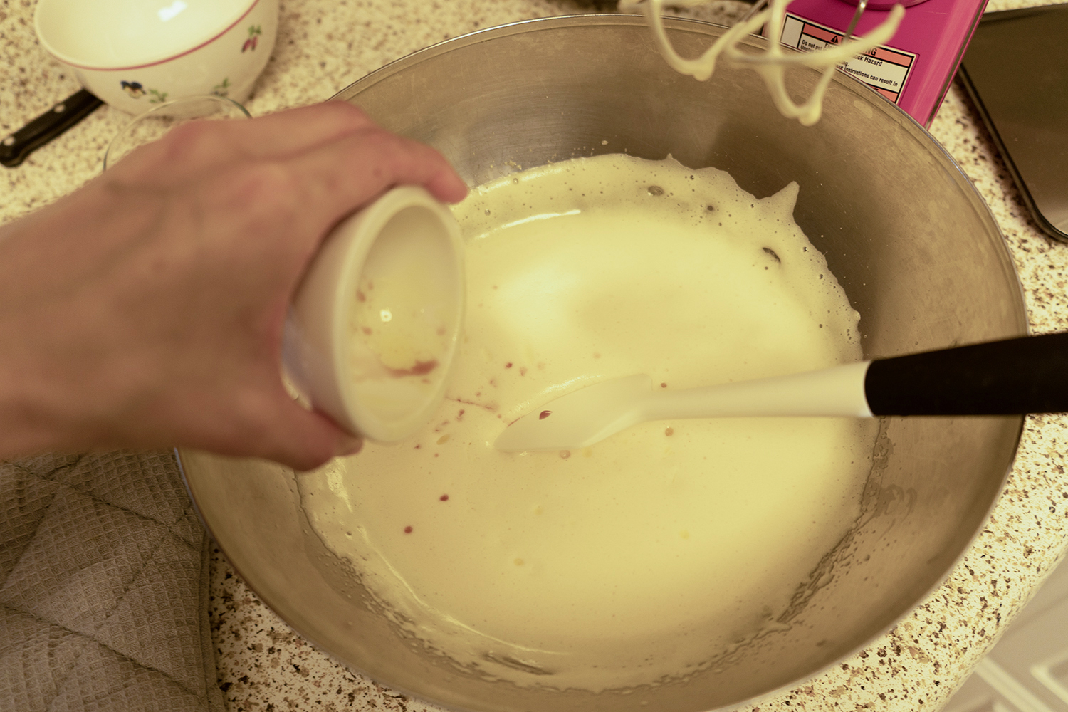 우유, 녹인 버터, 바닐라를 넣고 가볍게 섞고, 밀가루를 체 쳐서 퍼 올리듯 섞어요. 반죽을 너무 많이 휘저으면 볼륨이 가라앉으니 날가루가 보이지 않을 정도로만 가볍게 섞어줍니다.