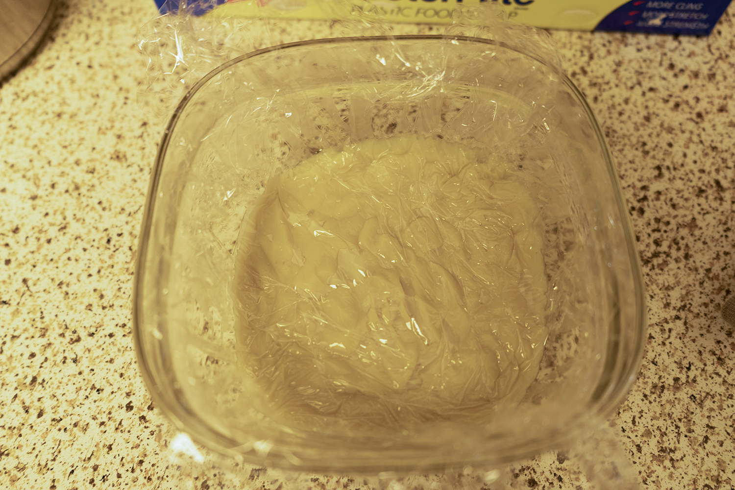 다 만들어진 커스터드 크림은 그릇에 옮겨 담고, 표면이 랩에 닿도록 덮고, 냉장고에서 잠시 쉬게 합니다.