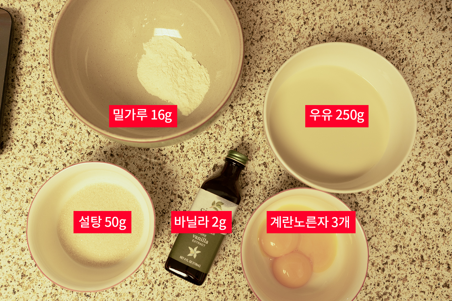 두 번째로 커스터드 크림을 만들어요. 재료는 아래와 같이 준비합니다.