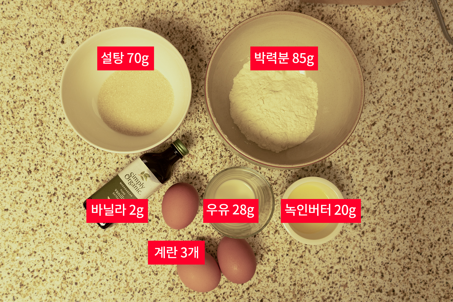 첫 번째로 케이크 시트를 만들기 위한 재료는 이렇게 준비합니다.