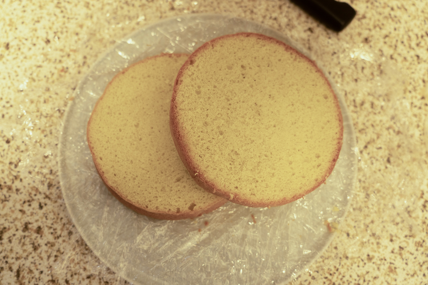 케이크 시트는 반으로 갈라줘요. 맨 위쪽은 모양이 평평하지 않으니 그 부분은 잘라서 정리해 주세요.