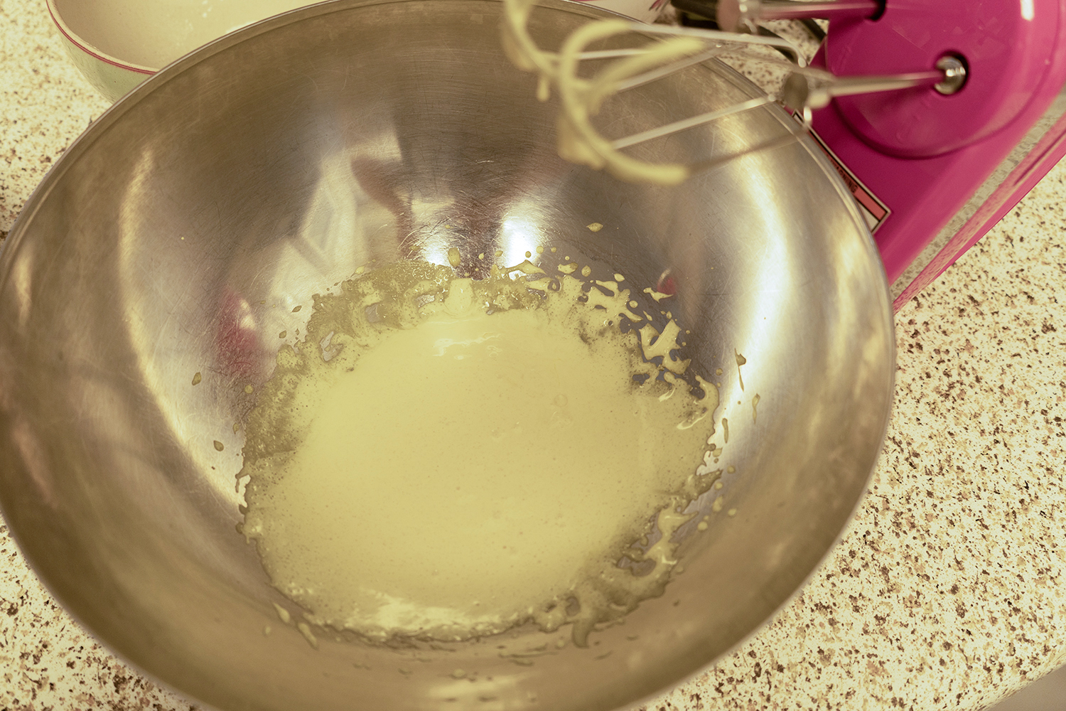 반죽을 흘렸을 때 자국이 쉽게 사라지지 않을 정도까지 진행하고, 저속으로 잔거품을 정리합니다.