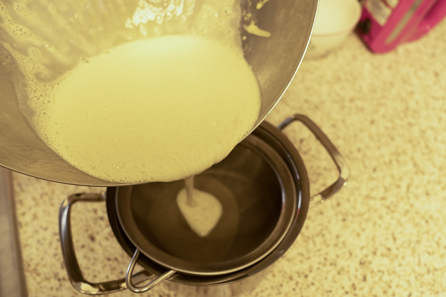 다 섞인 재료를 체에 걸러서 냄비로 옮겨요. 바닐라를 넣고, 질감이 단단해질 때까지 중약불로 조절해 가며, 저어 줍니다.