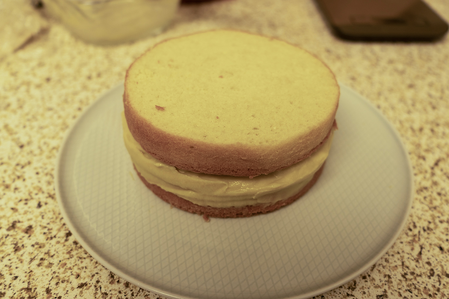 시트를 맨 아래에 깔고, 커스터드 크림을 잔뜩 올려요. 그리고 남은 케이크 시트로 덮어줍니다.