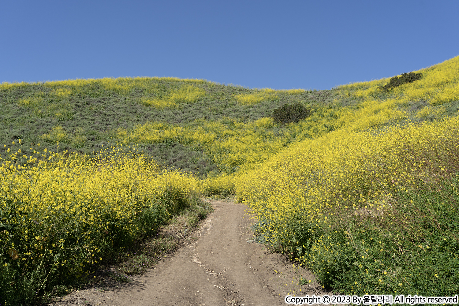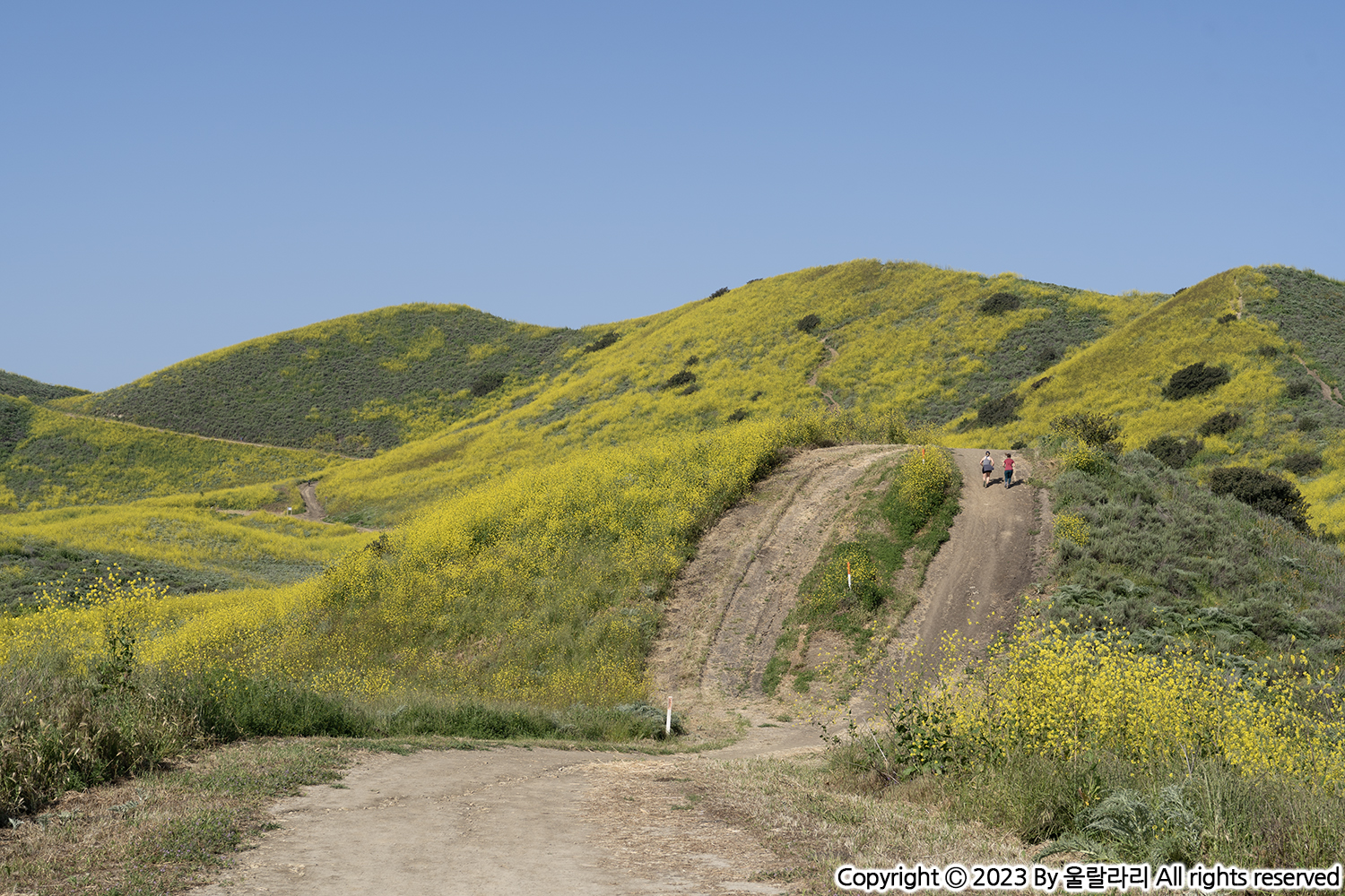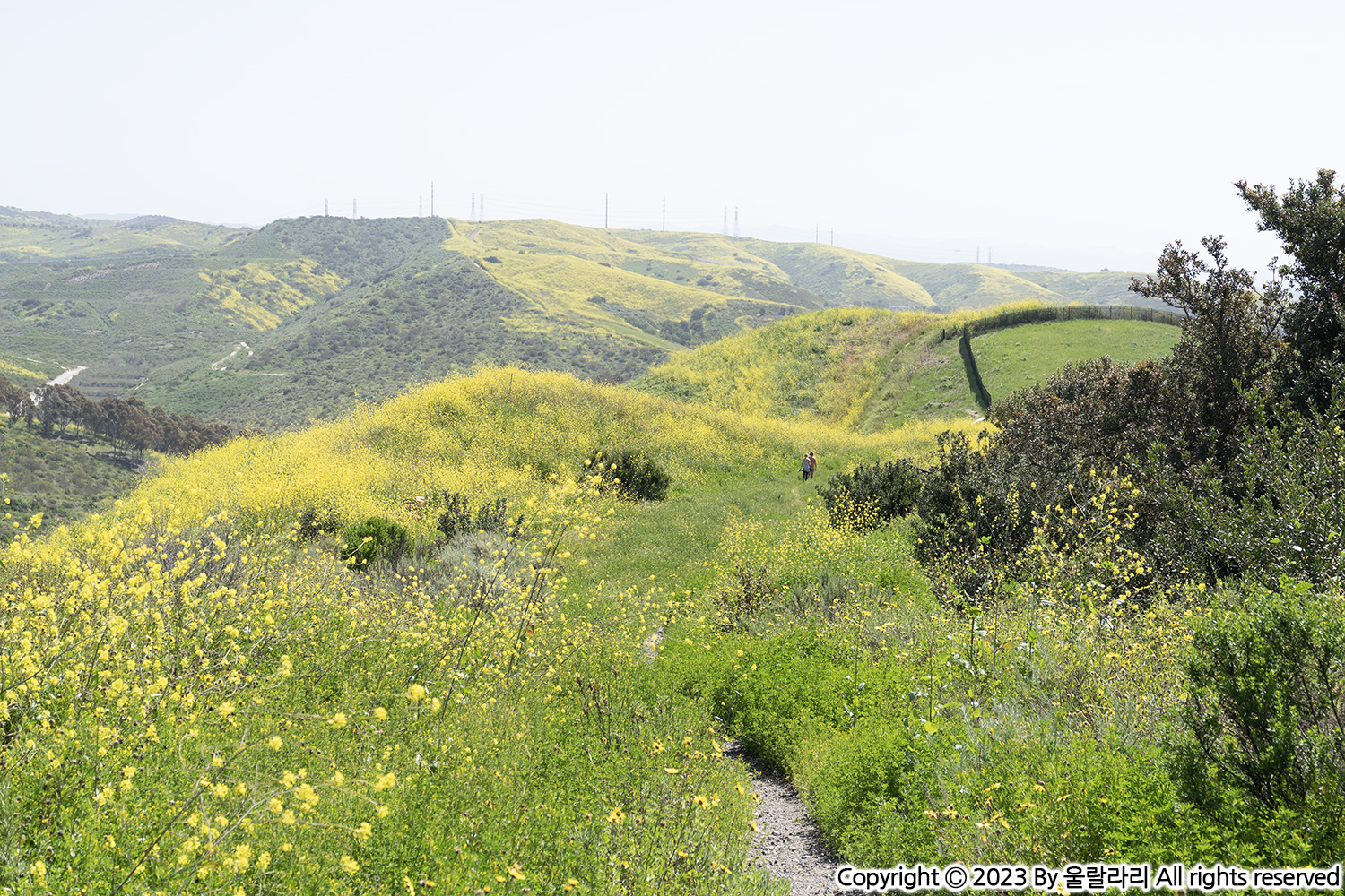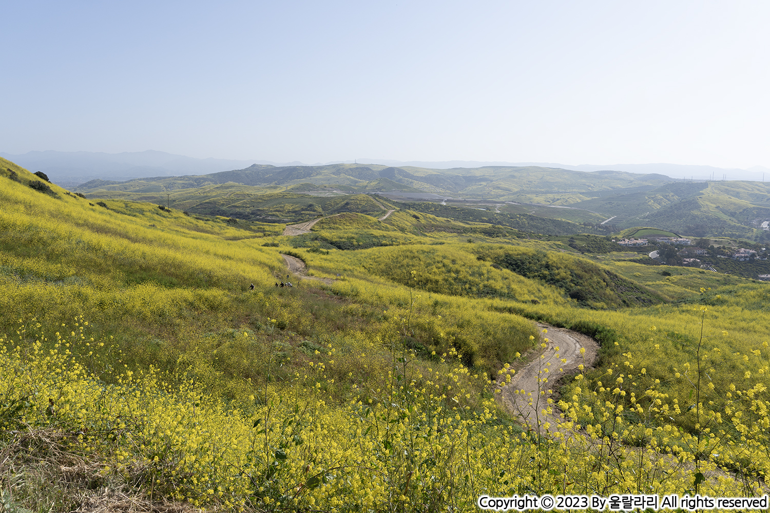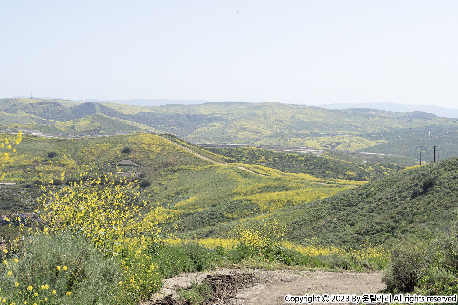 지금 걷고 있는 곳뿐만 아니라 멀리 보이는 산들도 노란 카펫이 깔려 있어요. 날씨가 조금 아쉽죠. 캘리포니아(특히 LA)는 날씨가 정말 좋기로 유명하죠. 겨울에도 영상이니까요. 하지만 공기는 좋지 않아요. ㅎㅎㅎ