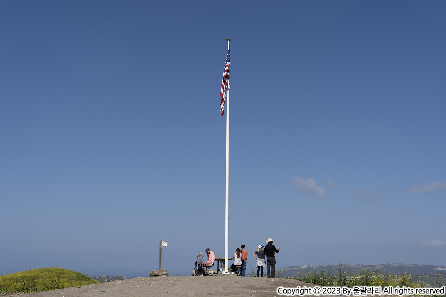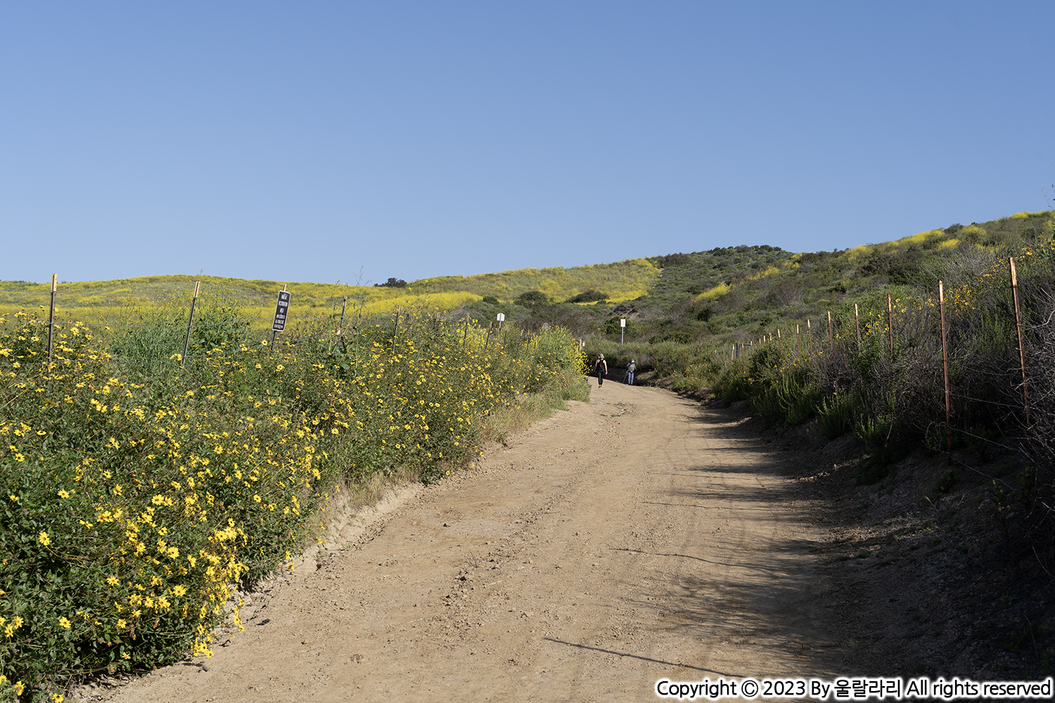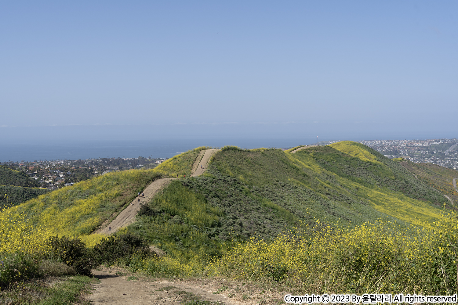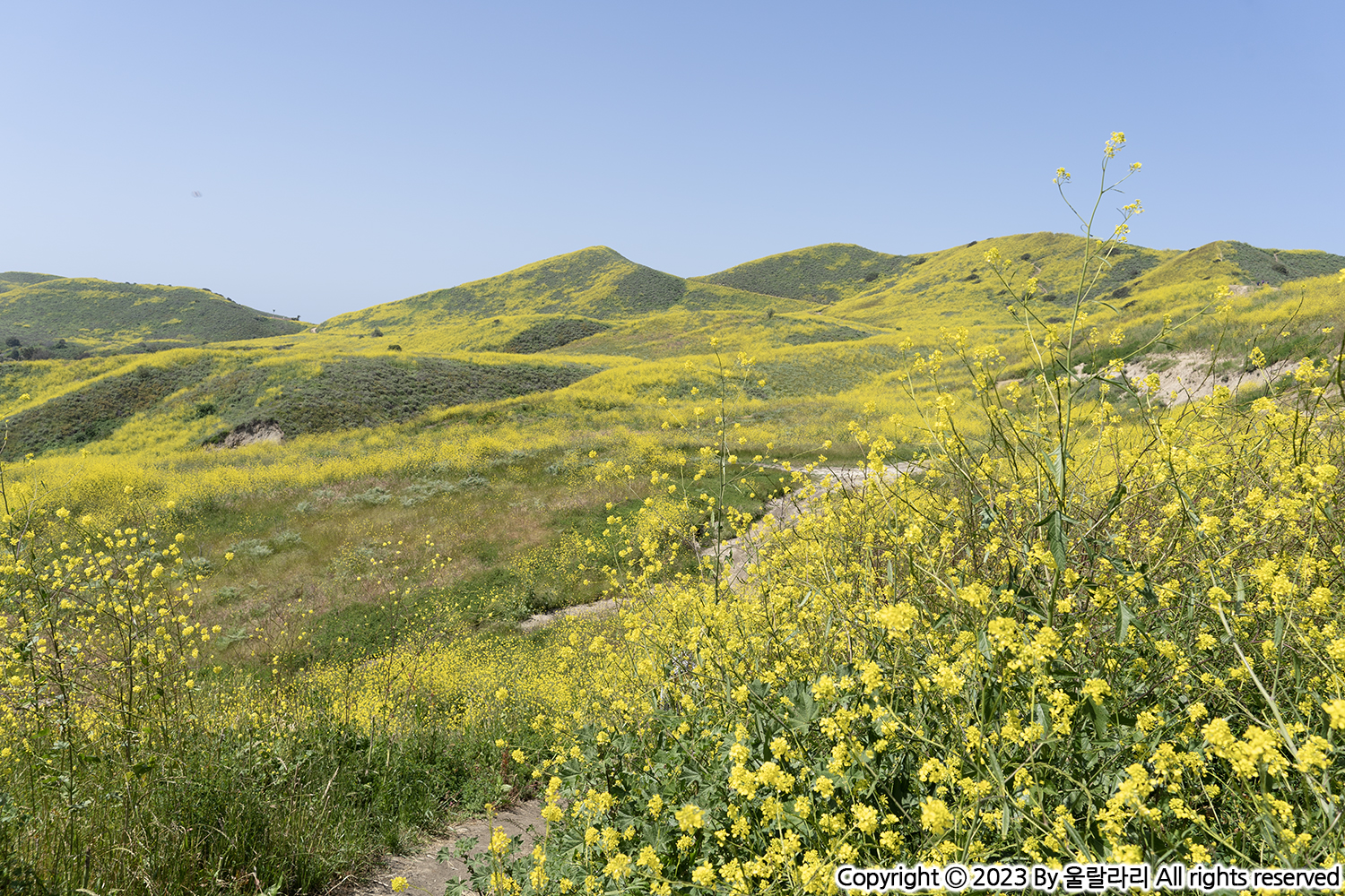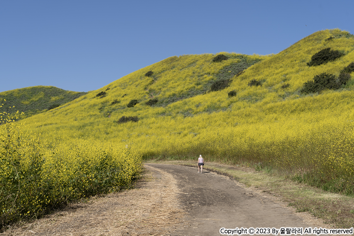 지금 걷고 있는 곳뿐만 아니라 멀리 보이는 산들도 노란 카펫이 깔려 있어요. 날씨가 조금 아쉽죠. 캘리포니아(특히 LA)는 날씨가 정말 좋기로 유명하죠. 겨울에도 영상이니까요. 하지만 공기는 좋지 않아요. ㅎㅎㅎ