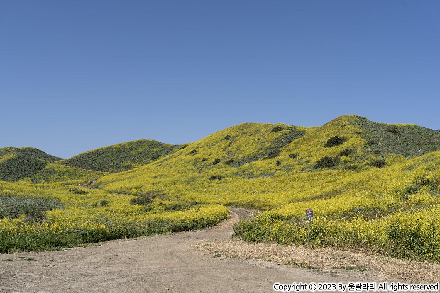 구글맵에 Roller Coaster Ridge Trailhead를 검색하고, 출발. Camino Le Los Mares 도로의 끝 지점이 트레일 시작점입니다. 무료 스트릿 파킹이 가능합니다. 다른 트레일은 겨자꽃을 보려면 어느 정도 걸어야 하는데, 여긴 시작부터 노란 물결입니다.