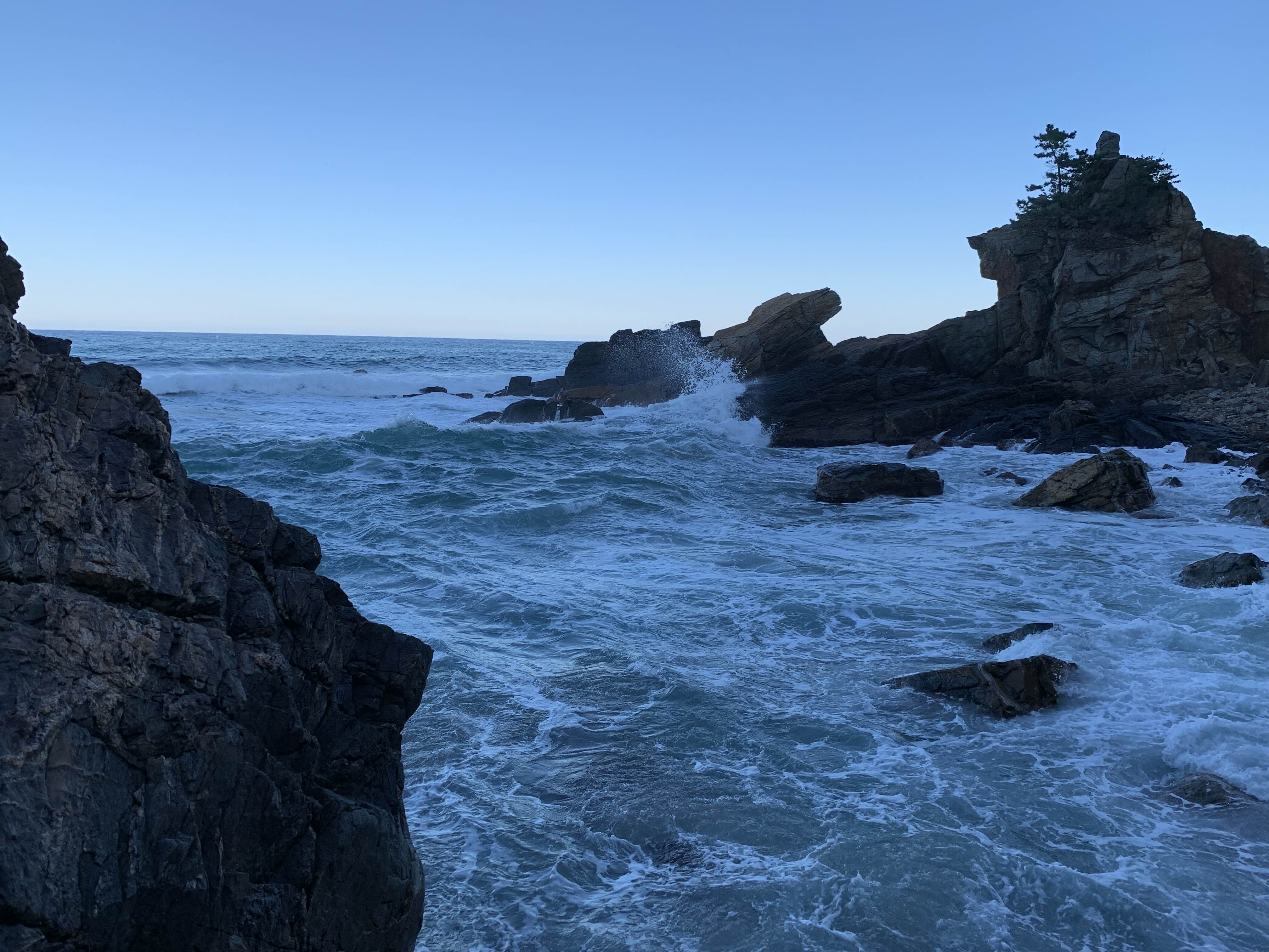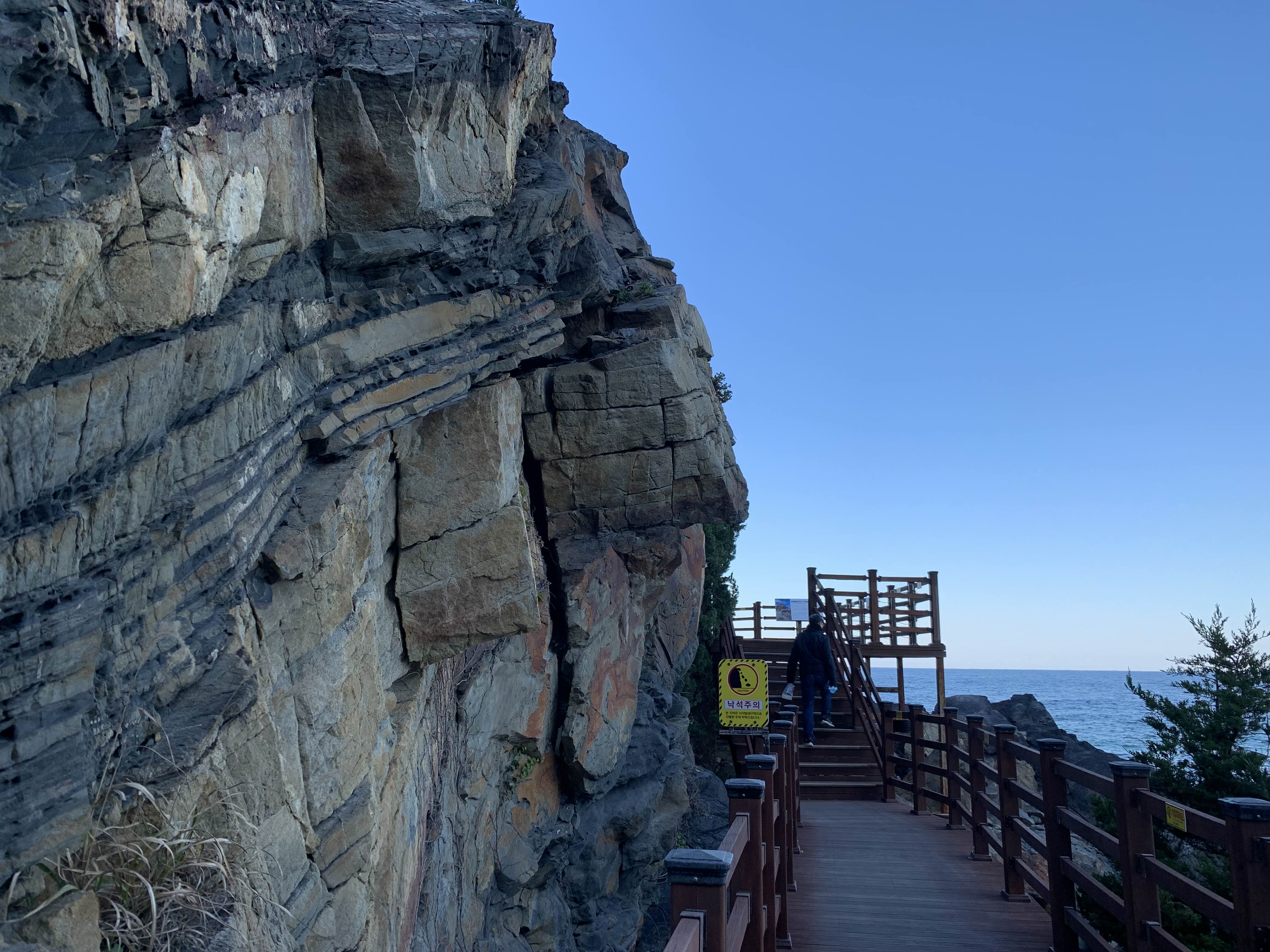 캘리포니아에서 바다를 그렇게나 질리게 봤으면서도 한국 동해 바다는 또 다른 매력이 있어서 오길 정말 잘 했다는 생각이 들었어요. 정동은 임금이 거처하는 한양에서 정방향으로 동쪽에 있다는 뜻이고, 심곡은 깊은 골짜기 안에 있는 마을이란 의미라고 합니다. 정동 심곡 바다부채길은 정동진의 부채끝 지형과 탐방로가 위치한 지형의 모양이 바다를 향해 부채를 펼쳐놓은 모양과 같아서 선정된 이름입니다. 천연기념물 제 437호로 지정된 곳이며, 230만년 전 지각변동을 관찰할 수 있는 국내 유일의 해안단구 관광지입니다.