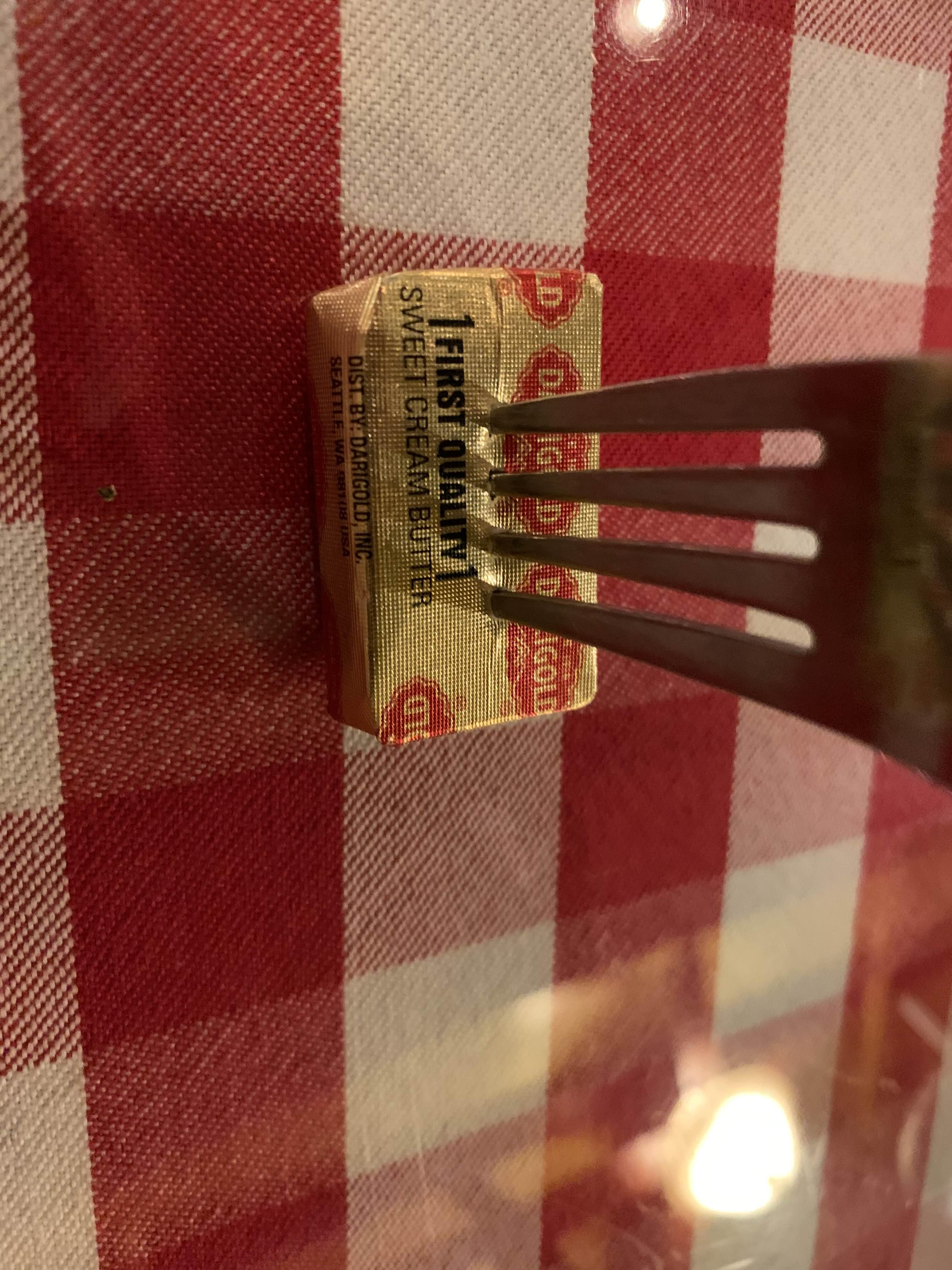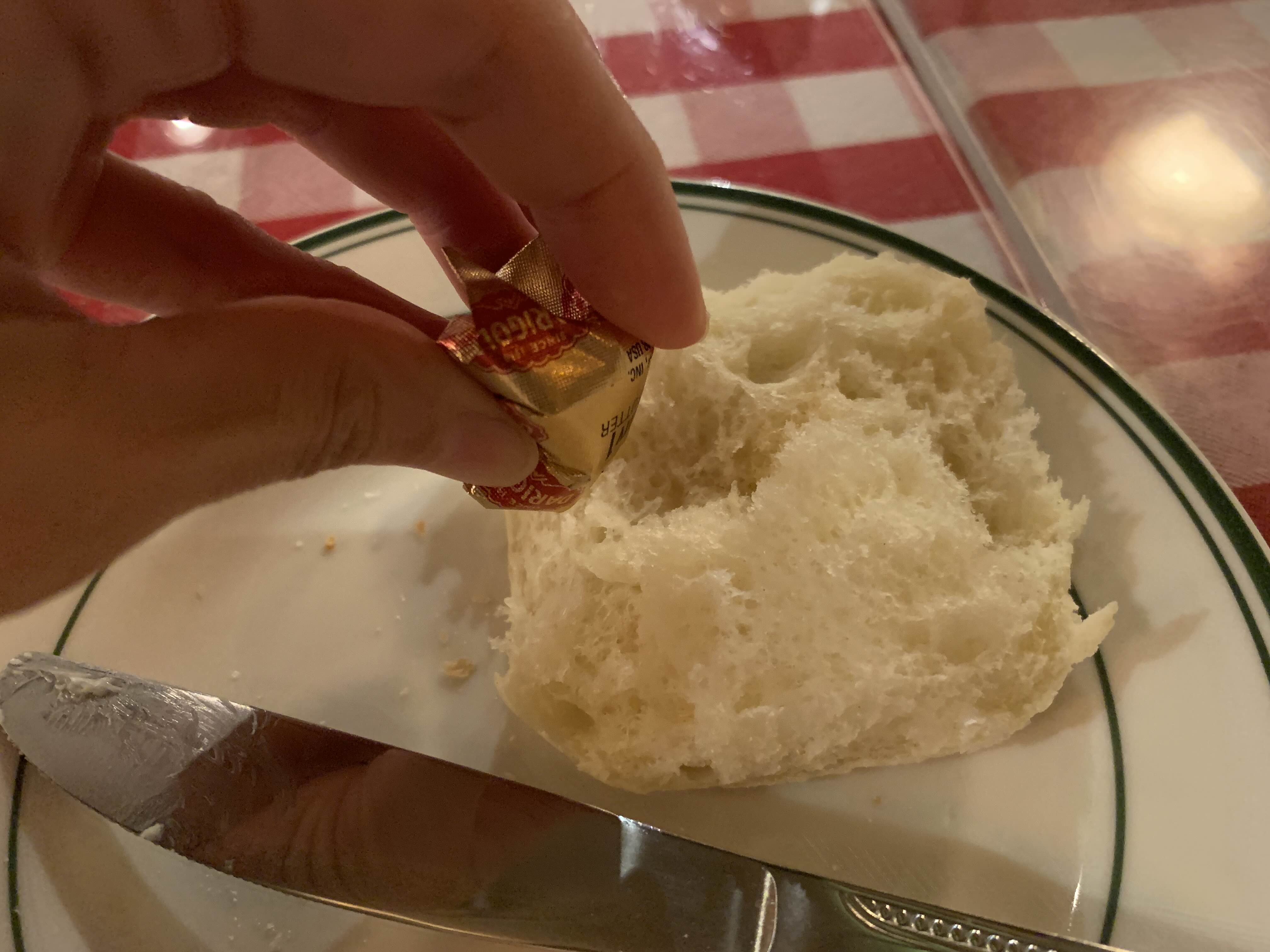 자리 안내를 받고, 식전빵을 뇸뇸합니다. 곰배님한테 '빵에 버터 어떻게 바르는지 알아?' 라며 얼마 전에 본 영상을 토대로 따라 해 봅니다. 이렇게 버터를 포장채로 포크로 꼭 찌르고 쭉 짜면 버터가 주르륵 나오... 나와야 하는데? 어? 왜 안 나오지? -_- 곰배님이 낄낄대며 비웃네요. 쳇! 내가 이 집 식전빵이 맛있어서 봐주는 줄 알아.